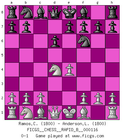 Last move : 0-1 2009 March 31 13:37:36 [Event "FICGS__CHESS__RAPID_B__000116"] [Site "FICGS"] [Date "2009.02.23"] [Round "1"] [White "Ramos,Cristobal"] [Black "Anderson,Lawrence"] [Result "0-1"] [WhiteElo "1800"] [BlackElo "1800"] 1.e4 c5 2.Nf3 d6 3.d4 cxd4 4.Nxd4 Nf6 0-1 This chess game has been lost on time (started : 2009.02.23 21:4:25) Sicilian Player Black won this chess game. Follow this game move after move (download)White lost because he failed to remember the right continuation and had to think up the moves himself. (Siegbert Tarrasch) Sitze auf Deine Hände. (Siegbert Tarrasch) Un jugador que es sorprendido, esta derrotado a medias. (Proverbio) Le succès, c'est être capable d'aller d'échec en échec sans perdre son enthousiasme. (Winston Churchill) He is a liar. I just don't know what the lie is yet. (Horatio Caine, C.S.I. Miami)
