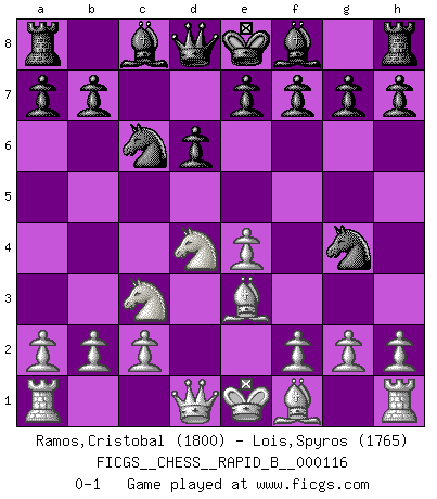 Last move : 0-1 2009 April 2 13:48:7 [Event "FICGS__CHESS__RAPID_B__000116"] [Site "FICGS"] [Date "2009.02.23"] [Round "1"] [White "Ramos,Cristobal"] [Black "Lois,Spyros"] [Result "0-1"] [WhiteElo "1800"] [BlackElo "1765"] 1.e4 c5 2.Nf3 Nc6 3.d4 cxd4 4.Nxd4 Nf6 5.Nc3 d6 6.Be3 Ng4 0-1 This chess game has been lost on time (started : 2009.02.23 21:4:25) Sicilian defense Player Black won this chess game. Follow this game move after move (download)By playing at Chess then, we may learn: First: Foresight... Second: Circumspection... Third: Caution... And lastly, we learn by Chess the habit of not being discouraged by present bad appearances in the state of our affairs, the habit of hoping for a favorable chance, and that of persevering in the secrets of resources. (Benjamin Franklin) Es ist besser die Steine des Gegners zu opfern. (Savielly Grigorievitsch Tartakower) Dejen al perfeccionista jugar por correo. (Yasser Seirawan) Fischer est le meilleur joueur du monde et Karpov n'est qu'un joueur de bistrot. (Garry Kasparov, agé de 16 ans) I find television to be very educating. Every time somebody turns on the set, I go in the other room and read a book. (Groucho Marx)