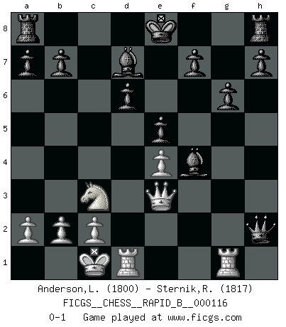 Last move : 0-1 2009 March 22 22:0:6 [Event "FICGS__CHESS__RAPID_B__000116"] [Site "FICGS"] [Date "2009.02.23"] [Round "1"] [White "Anderson,Lawrence"] [Black "Sternik,Ryszard"] [Result "0-1"] [WhiteElo "1800"] [BlackElo "1817"] 1.e4 c5 2.Nf3 Nc6 3.d4 cxd4 4.Nxd4 Nf6 5.Nc3 d6 6.Be3 Ng4 7.Be2 Nxe3 8.Qd2 Nxg2+ 9.Kd1 Nxd4 10.Qxd4 Bd7 11.Rg1 Nf4 12.Kd2 Nxe2 13.Nxe2 e5 14.Qe3 Qh4 15.Rad1 g6 16.Kc1 Bh6 17.f4 Qxh2 18.Nc3 Bxf4 0-1 Sicilian defense Player Black won this chess game. Follow this game move after move (download)Alekhine is a poet who creates a work of art out of something that would hardly inspire another man to send home a picture post card. (Max Euwe) Ich verstehe mehr vom Schach als irgendein anderer lebender Meister. (José Raúl Capablanca) El jugador de combinación piensa hacia adelante; comienza de la posición dada y trabaja las movidas contundentes en su mente. (Emanuel Lasker) Les pièces de l'échiquier étaient impitoyables. Elles le retenaient, elles l'absorbaient. Il y avait de l'horreur en cela, mais aussi une harmonie unique. Car, qu'y a-t-il dans le monde, à part les échecs ? (V. Nabokov) O divine art of subtlety and secrecy! Through you we learn to be invisible, through you inaudible and hence we can hold the enemy's fate in our hands. (Sun Tzu)