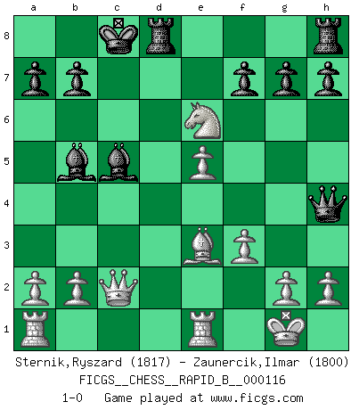 Last move : 1-0 2009 February 28 11:34:36 [Event "FICGS__CHESS__RAPID_B__000116"] [Site "FICGS"] [Date "2009.02.23"] [Round "1"] [White "Sternik,Ryszard"] [Black "Zaunercik,Ilmar"] [Result "1-0"] [WhiteElo "1817"] [BlackElo "1800"] 1.e4 e5 2.Nf3 Nc6 3.d4 exd4 4.Bc4 Nf6 5.e5 d5 6.Bb5 Ne4 7.Nxd4 Bd7 8.Bxc6 Bxc6 9.O-O Bd7 10.Re1 c5 11.Ne2 Bc6 12.c3 Qh4 13.Be3 O-O-O 14.f3 d4 15.cxd4 cxd4 16.Nxd4 Bc5 17.Nc3 Ng5 18.Ncb5 Bxb5 19.Qc2 Ne6 20.Nxe6 1-0 Scotch gambit : Dubois-Reti defense Kingside Castling by player White (move 9) Queenside Castling by player Black (move 13) Player White won this chess game. Follow this game move after move (download)Chess is a fairy tale of 1001 blunders. (Savielly Tartakower) Gegen einen Schachcomputer zu verlieren ist wie Löcher in den Strümpfen zuhaben. Es ist nicht peinlich, solange man der einzige ist der es weiß. (Anonymous) El Ajedrez no es como la vida... ¡tiene reglas!. (Mark Pasternak) Les erreurs sont comme les malheurs, elles n'arrivent jamais seules. (Siegbert Tarrasch) I have opinions of my own - strong opinions - but I don't always agree with them. (George Bush)