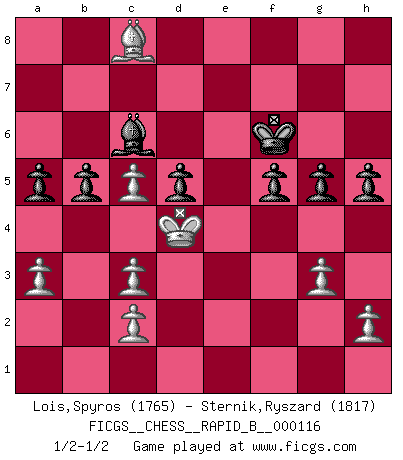 Last move : 1/2-1/2 2009 March 6 22:23:55 [Event "FICGS__CHESS__RAPID_B__000116"] [Site "FICGS"] [Date "2009.02.23"] [Round "1"] [White "Lois,Spyros"] [Black "Sternik,Ryszard"] [Result "1/2-1/2"] [WhiteElo "1765"] [BlackElo "1817"] 1.e4 e6 2.d4 d5 3.Nc3 Nf6 4.Bg5 Bb4 5.e5 h6 6.Bd2 Bxc3 7.Bxc3 Ne4 8.Qg4 O-O 9.Bd3 Nxc3 10.bxc3 c5 11.dxc5 Qc7 12.Nf3 Nd7 13.O-O Nxe5 14.Nxe5 Qxe5 15.Qd4 Qc7 16.Rab1 Bd7 17.Rfe1 Bc6 18.f4 Rae8 19.Re3 Re7 20.Rbe1 Rfe8 21.a3 Kh8 22.R3e2 Qa5 23.Qb4 Qd8 24.Qd4 b5 25.Qe5 Qc7 26.f5 Qxe5 27.Rxe5 Kg8 28.Kf2 a6 29.Ke3 f6 30.Rxe6 Rxe6+ 31.fxe6 Rxe6+ 32.Kd2 Rxe1 33.Kxe1 Kf7 34.Bf5 g6 35.Bc8 a5 36.Kd2 f5 37.Kd3 Kf6 38.Kd4 g5 39.g3 h5 1/2-1/2 French : MacCutcheon, Lasker variation Kingside Castling by player Black (move 8) Kingside Castling by player White (move 13) This chess game ended in a draw. Follow this game move after move (download)There must have been a time when men were demigods, or they could not have invented Chess. (Gustav Schenk) Jeder leidlich begabte Spieler, er braucht keineswegs hervorragend veranlagt zu sein, kann es zum Meister bringen. Aber das ist ja auch gar nicht nötig! Der richtige Standpunkt ist es, zu seinem Vergnügen zu spielen, und man glaube ja nicht, dass der Genuss proportional dem Können sei. (Siegbert Tarrasch) Yo nunca en mi vida he jugado la Defensa Francesa, que viene siendo la más aburrida de todas las Aperturas. (Wilhelm Steinitz) Il s'avisa de me proposer d'apprendre les échecs qu'il jouait un peu... me voilà forcené des échecs. J'achète un échiquier, je m'enferme dans ma chambre, j'y passe des jours et des nuits à vouloir apprendre par cur toutes les parties. (Jean-Jacques Rousseau, Confessions) Follow your passion, and success will follow you. (Arthur Buddhold)