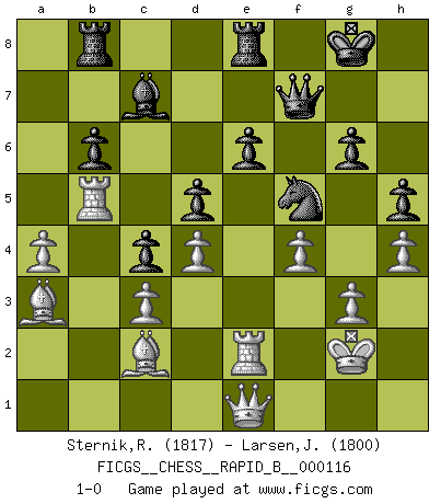 Last move : 1-0 2009 June 24 20:43:1 [Event "FICGS__CHESS__RAPID_B__000116"] [Site "FICGS"] [Date "2009.02.23"] [Round "1"] [White "Sternik,Ryszard"] [Black "Larsen,Jarl Eirik"] [Result "1-0"] [WhiteElo "1817"] [BlackElo "1800"] 1.e4 e5 2.Nf3 Nf6 3.Nxe5 d6 4.Nf3 Nxe4 5.d4 d5 6.Bd3 Bb4+ 7.c3 Bd6 8.O-O O-O 9.c4 Be6 10.Re1 Re8 11.c5 Be7 12.Nc3 Nxc3 13.bxc3 g6 14.Qa4 Qd7 15.Bb5 c6 16.Bd3 Qc7 17.Ng5 Nd7 18.Nxe6 fxe6 19.f4 Bf8 20.Qc2 b6 21.cxb6 axb6 22.a4 c5 23.Qb2 c4 24.Bc2 Bd6 25.g3 Qc6 26.Rb1 Bf8 27.Bd1 Qd6 28.Qe2 Bg7 29.Bc2 Bf8 30.h3 Qc6 31.Be3 Ra5 32.Bf2 Nf6 33.Qe3 Bd6 34.Kg2 Bc7 35.Rb4 R5a8 36.Kg1 Qd6 37.Re2 Qd8 38.Rb5 Qd7 39.Rb2 Nh5 40.Re1 Ng7 41.Qe2 Nf5 42.Qg4 Rf8 43.Rb5 Kg7 44.R5b1 Qf7 45.Qe2 Rae8 46.Rf1 Qf6 47.Rb5 h5 48.h4 Ra8 49.Kg2 Qf7 50.Re1 Rfe8 51.Kh3 Nh6 52.R5b1 Qd7 53.Kg2 Nf5 54.Rb4 Qf7 55.Rb2 Qf8 56.R2b1 Nh6 57.Rb4 Ng4 58.Qf3 Qd6 59.Be3 Qd7 60.Bd2 Ra5 61.Qe2 Qc6 62.Rb2 Ra7 63.Rb5 R7a8 64.Qf3 Rab8 65.Qd1 Qd7 66.Bc1 Qd8 67.Re2 Bd6 68.Bd2 Qf6 69.Qb1 Bc7 70.Qe1 Qf7 71.Bc1 Qd7 72.Bd2 Nh6 73.Qb1 Nf5 74.Qe1 Kg8 75.Bc1 Bd6 76.Be3 Qf7 77.Bc1 Bc7 78.Ba3 1-0 Petrov : Classical attack Kingside Castling by player White (move 8) Kingside Castling by player Black (move 8) Player White won this chess game. Follow this game move after move (download)In complicated positions, Bobby Fischer hardly had to be afraid of anybody. (Paul Keres) Fischer ist das größte Genie, das je vom Schachhimmel heruntergestiegen ist. (Mikhail Nekhemyevich Tal) El Ajedrez es una manera fabulosa para que los niños aprendan a autovalorarse y a autoestimarse. (Saudin Robovic) Des points faibles ou des trous dans la position de l'adversaire doivent être occupés par des pièces et non pas par des pions. (Siegbert Tarrasch) The difference between stupidity and genius is that genius has its limits. (Murphy)
