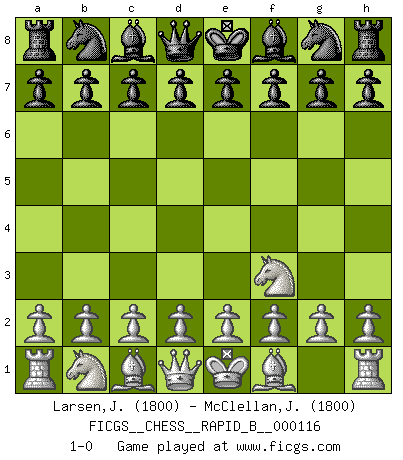 Last move : 1-0 2009 March 26 0:0:41 [Event "FICGS__CHESS__RAPID_B__000116"] [Site "FICGS"] [Date "2009.02.23"] [Round "1"] [White "Larsen,Jarl Eirik"] [Black "McClellan,Joshua"] [Result "1-0"] [WhiteElo "1800"] [BlackElo "1800"] 1.Nf3 1-0 This chess game has been lost on time (started : 2009.02.23 21:4:25) Reti Opening Player White won this chess game. Follow this game move after move (download)You need not play well - just help your opponent to play badly. (Genrikh Chepukaitis) Offensichtlich kennt Kasparow nichts anderes als Schach, und ich könnte 500 weitere Spieler dieser Sorte benennen. (Judith Polgar) Fischer sacrificó virtualmente todo lo que la mayoría de nosotros los 'debiles' (término que él usa) valoramos, respetamos y apreciamos por el amor de un astuto, a menudo hermoso tablero de juego, por el privilegio ambivalente de ser su mas grande maestro. (Paul Kollar) Donnez-moi un Cavalier en 6e et je gagnerais toutes mes parties. (Steinitz) Hold em is to stud what chess is to checkers. (Johnny Moss)