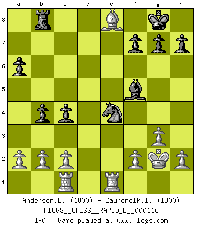 Last move : 1-0 2009 May 28 18:48:4 [Event "FICGS__CHESS__RAPID_B__000116"] [Site "FICGS"] [Date "2009.02.23"] [Round "1"] [White "Anderson,Lawrence"] [Black "Zaunercik,Ilmar"] [Result "1-0"] [WhiteElo "1800"] [BlackElo "1800"] 1.e4 e5 2.Nf3 Nc6 3.Bb5 a6 4.Ba4 Nf6 5.Nc3 Be7 6.d4 exd4 7.Nxd4 O-O 8.Nxc6 dxc6 9.Be3 b5 10.Bb3 b4 11.Na4 Nxe4 12.O-O Bd6 13.Re1 Qh4 14.g3 Qh3 15.Qf3 Bf5 16.Qg2 Qxg2+ 17.Kxg2 Rad8 18.Rac1 Be7 19.Bf4 Bd6 20.Bxd6 cxd6 21.Nb6 Rfe8 22.Ba4 Rb8 23.Nc4 d5 24.Bxc6 dxc4 25.Bxe8 1-0 This chess game has been lost on time (started : 2009.02.23 21:4:25) Ruy Lopez : Four knights (Tarrasch) variation Kingside Castling by player Black (move 7) Kingside Castling by player White (move 12) Player White won this chess game. Follow this game move after move (download)In Chess, just as in life, today's bliss may be tomorrow's poison. (Assaic) Ich las kürzlich ein Buch von Nietzsche. Er sagte Religion verdumme nur die Menschen. Ich stimme zu. (Robert James Fischer) Con el tiempo, empecé a progresar en partidas decisivas. Tal vez porque me di cuenta de una simple verdad: no solo estaba yo nervioso sino también mi oponente. (Mikhail Tal) Lorsque vous vous retrouvez devant une position atroce, ne tendez pas un ultime piège dérisoire avec l'intention d'abandonner si l'adversaire le déjoue ! Faites-vous plutôt un devoir de résister comme si votre vie en dépendait. Jouez le coup qui vous déplairait au centuple si vous étiez dans la peau de votre tortionnaire ! Now be brave and don't look back. Don't look back. (Shmi Skywalker in Star Wars ep.1)