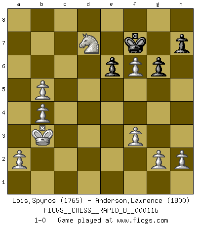 Last move : 1-0 2009 April 29 6:54:26 [Event "FICGS__CHESS__RAPID_B__000116"] [Site "FICGS"] [Date "2009.02.23"] [Round "1"] [White "Lois,Spyros"] [Black "Anderson,Lawrence"] [Result "1-0"] [WhiteElo "1765"] [BlackElo "1800"] 1.e4 c5 2.Nf3 d6 3.d4 cxd4 4.Nxd4 Nf6 5.Nc3 g6 6.f3 Bg7 7.Be3 O-O 8.Bc4 Nc6 9.Qd2 Bd7 10.O-O-O e6 11.Nxc6 Bxc6 12.Qxd6 Qxd6 13.Rxd6 Rad8 14.Rxd8 Rxd8 15.Bxa7 Be8 16.Rd1 Rxd1+ 17.Kxd1 Bc6 18.Bb5 Bxb5 19.Nxb5 Nd7 20.Bd4 Bxd4 21.Nxd4 Nc5 22.Nb5 Kf8 23.b4 Na4 24.Kd2 Nb2 25.Nd6 b6 26.c4 Na4 27.e5 Ke7 28.Kc2 f6 29.Nc8+ Kd8 30.exf6 Ke8 31.Kb3 b5 32.cxb5 Nb6 33.Nxb6 Kf7 34.Nd7 1-0 Sicilian : Dragon variation Kingside Castling by player Black (move 7) Queenside Castling by player White (move 10) Player White won this chess game. Follow this game move after move (download)He who takes the Queen's Knight's Pawn will sleep in the streets. (Anonymous) Herr Iljumschinow ist ein etwas merkwürdiger Geschäftsmann: Er arbeitet zusammen mit Leuten wie Muammar al-Gaddafi; früher ist das Saddam Hussein gewesen. (Joel Lautier) Vive, pierde y aprende al observar a tu oponente como gana. (Amber Steenbock) Un footballeur joue avec ses pieds, parfois avec sa tête. Un joueur d'échecs ne joue qu'avec sa tête. Et quand il ne joue plus, il meurt. (Jacob Murray) Over-the-board chess is the favorite of mortals, correspondence chess is the favorite of the gods. (Eduard Dyckhoff)