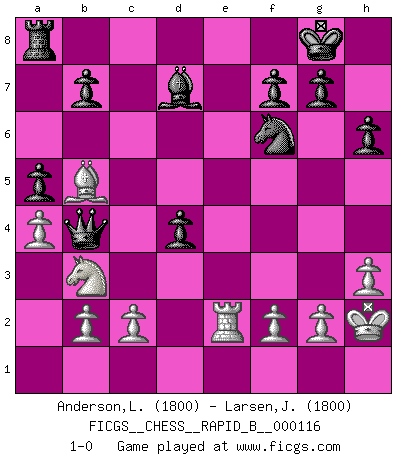 Last move : 1-0 2009 May 26 18:41:26 [Event "FICGS__CHESS__RAPID_B__000116"] [Site "FICGS"] [Date "2009.02.23"] [Round "1"] [White "Anderson,Lawrence"] [Black "Larsen,Jarl Eirik"] [Result "1-0"] [WhiteElo "1800"] [BlackElo "1800"] 1.e4 e6 2.d4 d5 3.Nd2 c5 4.exd5 Qxd5 5.Ngf3 cxd4 6.Bc4 Qd6 7.O-O Nf6 8.Nb3 Nc6 9.Bg5 e5 10.Re1 Be7 11.Rc1 O-O 12.Qd2 a5 13.a4 Bf5 14.Re2 h6 15.Bh4 Qc7 16.Rce1 Rfe8 17.Bg3 Bb4 18.Nxe5 Bxd2 19.Rxd2 Nxe5 20.Bxe5 Rxe5 21.Rxe5 Qxe5 22.h3 Qe1+ 23.Kh2 Bd7 24.Re2 Qb4 25.Bb5 1-0 This chess game has been lost on time (started : 2009.02.23 21:4:25) French : Tarrasch, Open variation Kingside Castling by player White (move 7) Kingside Castling by player Black (move 11) Player White won this chess game. Follow this game move after move (download)Tactics flow from a superior position. (Bobby Fischer) Kasparov stellt für gewöhnlich die Regeln auf und bricht sie dann selbst wieder. (Alexej Shirov) Cada Peón es una Reina en potencia. (James Mason) Dans le domaine de la peinture, de la gravure et de la sculpture, dès la première décennie de notre siècle, les artistes abandonnent la représentation de la partie d'échecs pour se concentrer sur les pièces, sur les échiquiers et sur toutes les variations auxquelles les unes et les autres peuvent donner lieu. On passe en quelque sorte d'un thème social à un thème musical (au sens de la musica médiévale, c'est-à-dire d'une notion qui inclue le rythme, l'harmonie, la construction et la déconstruction, etc.). Graphiquement et picturalement, l'échiquier apparaît comme une structure ouverte, dynamique, d'une richesse infinie, autorisant toutes les combinatoires et débouchant sur des mouvements et des rythmes de nature exponentielle. (Michel Pastoureau) Unless in communicating with it one says exactly what one means, trouble is bound to result. (Alan Turing, about computers)