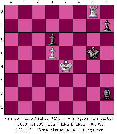 Last move : 1/2-1/2 2009 June 4 13:16:15 [Event "FICGS__CHESS__LIGHTNING_BRONZE__000052"] [Site "FICGS"] [Date "2009.06.04"] [Round "1"] [White "van der Kemp,Michel"] [Black "Gray,Garvin"] [Result "1/2-1/2"] [WhiteElo "1904"] [BlackElo "1986"] 1.e4 c5 2.Nf3 Nc6 3.d4 cxd4 4.Nxd4 Nf6 5.Nc3 e5 6.Ndb5 d6 7.Bg5 a6 8.Na3 b5 9.Nd5 Be7 10.Bxf6 Bxf6 11.c3 O-O 12.Nc2 Bg5 13.a4 bxa4 14.Rxa4 a5 15.Bc4 Rb8 16.b3 Kh8 17.Nce3 Be6 18.O-O Ne7 19.Nxe7 Bxe7 20.h3 g6 21.Ra2 Rb7 22.Nd5 Bh4 23.Re1 f5 24.g3 Bg5 25.h4 Bh6 26.exf5 Bxf5 27.h5 gxh5 28.Qxh5 Bg5 29.Rea1 Ra7 30.Qe2 Be6 31.Qe4 Bf5 32.Qg2 Qa8 33.b4 Bd8 34.bxa5 Qc6 35.Bf1 Qc5 36.a6 Bg4 37.c4 Bf3 38.Qh3 Bxd5 39.cxd5 Bb6 40.Bg2 Raf7 41.Kh2 Rxf2 42.Rxf2 Rxf2 43.Rb1 e4 44.Kh1 e3 45.a7 Bxa7 46.Rb7 Qc1+ 47.Kh2 Rxg2+ 48.Qxg2 Qd1 49.Qb2+ Bd4 50.Rb8+ Kg7 51.Qb7+ Kg6 52.Rg8+ Kh6 53.Qf7 Qh5+ 54.Qxh5+ Kxh5 55.Kg2 e2 56.Re8 Be5 57.Kf2 e1Q+ 58.Kxe1 Bxg3+ 59.Ke2 Kg4 60.Kd3 Bh2 61.Ke4 Kg5 62.Rg8+ Kf6 63.Rf8+ Kg5 64.Rg8+ Kf6 65.Rf8+ Kg5 66.Rg8+ 1/2-1/2 Sicilian : Pelikan (Lasker/Sveshnikov) variation Kingside Castling by player Black (move 11) Kingside Castling by player White (move 18) 10 pieces endgame at move 54 : White KQRPP , Black KBPPP WHITE : King + 1 Queen 1 Rook 2 Pawns BLACK : King + 1 Bishop 3 Pawns 9 pieces endgame at move 54 : White KRPP , Black KBPPP WHITE : King + 1 Rook 2 Pawns BLACK : King + 1 Bishop 3 Pawns Promotion Queen by player Black (move 57) 8 pieces endgame at move 58 : White KRPP , Black KBPP WHITE : King + 1 Rook 2 Pawns BLACK : King + 1 Bishop 2 Pawns 7 pieces endgame at move 58 : White KRP , Black KBPP WHITE : King + 1 Rook 1 Pawn BLACK : King + 1 Bishop 2 Pawns This chess game ended in a draw. Follow this game move after move (download)The only thing Chess players have in common is Chess. (Lodewijk Prins) Der Schachmeister von Heute braucht Courage, einen Killerinstinkt, Ausdauer und Arroganz. (Larry Evans) De todos mis libros Rusos, la defensa contiene y difunde el 'calor' mas grande que pudiese verse extraño al observar lo supremamente abstracto que el Ajedrez supuestamente es. (Vladimir Nabokov) Les Echecs ne sont pas pour les âmes timides. Ils requièrent un homme entier, qui ne s'arrête pas aveuglément à ce qui a été déjà établi, mais qui tente individuellement de sonder les profondeurs du jeu. (W. Steinitz) Chess is as much a mystery as women. (Purdy)