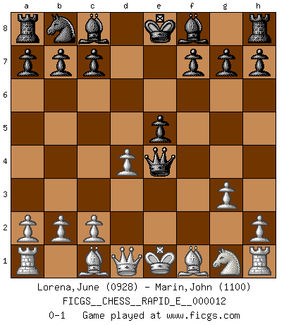 Last move : 0-1 2009 April 27 4:12:57 [Event "FICGS__CHESS__RAPID_E__000012"] [Site "FICGS"] [Date "2009.02.24"] [Round "1"] [White "Lorena,June"] [Black "Marin,John"] [Result "0-1"] [WhiteElo "0928"] [BlackElo "1100"] 1.d4 Nf6 2.Nc3 d5 3.e4 Nxe4 4.Nxe4 dxe4 5.f3 e5 6.fxe4 Qh4+ 7.g3 Qxe4+ 0-1 This chess game has been lost on time (started : 2009.02.24 16:4:57) Queen's pawn game Player Black won this chess game. Follow this game move after move (download)I had a toothache during the first game. In the second game I had a headache. In the third game it was an attack of rheumatism. In the fourth game, I wasn't feeling well. And in the fifth game? Well, must one have to win every game ? (Siegbert Tarrasch) Über Karpov: Er war und ist ein Vertreter der russischen Reaktionäre. Das steckt tief in seiner Seele, wehalb ich nicht nett mit ihm umgehen kann. (Viktor Kortschnoi) La enorme capacidad mental, en la que sin ella no puede un jugador de Ajedrez existir, es demasiado requerida por el Ajedrez al grado de que nunca podrá liberar su mente de este juego. (Albert Einstein) Horreur, mais aussi harmonie suprême : qu'y avait-il en effet au monde en dehors des échecs ? Le brouillard, l'inconnu, le non-être... (Vladimir Nabokov) When a man with money meets a man with experience, the man with experience leaves with money and the man with money leaves with experience. (Anonymous)