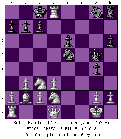 Last move : 1-0 2009 April 16 2:52:26 [Event "FICGS__CHESS__RAPID_E__000012"] [Site "FICGS"] [Date "2009.02.24"] [Round "1"] [White "Belaz,Egidio"] [Black "Lorena,June"] [Result "1-0"] [WhiteElo "1216"] [BlackElo "0928"] 1.e4 e5 2.f4 Nc6 3.Nf3 d6 4.Bc4 Be6 5.Bxe6 fxe6 6.O-O Qe7 7.fxe5 O-O-O 8.exd6 Rxd6 9.d3 h6 10.Nc3 g5 11.b3 g4 12.e5 Rd7 13.Nd2 Nxe5 14.Bb2 Qg5 15.Rxf8+ Rd8 16.Rxd8+ 1-0 This chess game has been lost on time (started : 2009.02.24 16:4:57) King's gambit Kingside Castling by player White (move 6) Queenside Castling by player Black (move 7) Player White won this chess game. Follow this game move after move (download)Fischer is under obligation to nobody. (Joseph Platz) Ein Kibitz ist einer, der deinem Gegner gute Ratschläge gibt. (Andrew Soltis) Antes de los Finales, los dioses han colocado el Juego Medio. (Siegbert Tarrasch) Fischer est le meilleur joueur du monde et Karpov n'est qu'un joueur de bistrot. (Garry Kasparov, agé de 16 ans) There will be no order, only chaos. (Sol Robeson in Pi by Darren Aronofsky)