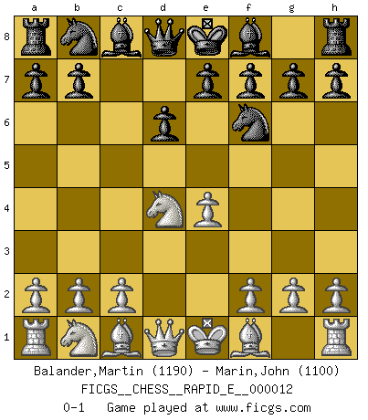 Last move : 0-1 2009 April 5 2:5:1 [Event "FICGS__CHESS__RAPID_E__000012"] [Site "FICGS"] [Date "2009.02.24"] [Round "1"] [White "Balander,Martin"] [Black "Marin,John"] [Result "0-1"] [WhiteElo "1190"] [BlackElo "1100"] 1.e4 c5 2.Nf3 d6 3.d4 cxd4 4.Nxd4 Nf6 0-1 This chess game has been lost on time (started : 2009.02.24 16:4:57) Sicilian Player Black won this chess game. Follow this game move after move (download)Chess, like any creative activity, can exist only through the combined efforts of those who have creative talent, and those who have the ability to organize their creative work. (Mikhail Botvinnik) Kein Schachspieler kann gut schlafen. (H. G. Wells) Cuando tengo las piezas blancas, yo gano porque soy blanco; Cuando tengo las piezas negras, yo gano porque soy Bogolyubov. (Bogolyubov) Karpov est une pièce de musée. (Garry Kasparov) Games, world of games... There's always an opponent, and there's always a victim. (Revolver, movie)