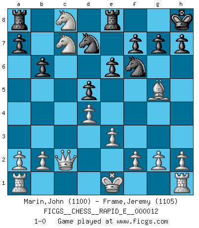Last move : 1-0 2009 April 19 16:18:29 [Event "FICGS__CHESS__RAPID_E__000012"] [Site "FICGS"] [Date "2009.02.24"] [Round "1"] [White "Marin,John"] [Black "Frame,Jeremy"] [Result "1-0"] [WhiteElo "1100"] [BlackElo "1105"] 1.d4 d5 2.c4 c6 3.Nf3 Nf6 4.Nc3 e6 5.Bg5 Be7 6.e3 Nbd7 7.Qc2 b6 8.cxd5 cxd5 9.Bb5 Bb7 10.Ne5 O-O 11.Bc6 Bxc6 12.Nxc6 Qe8 13.Nb5 Kh8 14.Nc7 Qc8 15.Nxe7 Re8 16.Nxc8 1-0 QGD Slav : 4.Nc3 Kingside Castling by player Black (move 10) Player White won this chess game. Follow this game move after move (download)We cannot resist the fascination of sacrifice, since a passion for sacrifices is part of a Chessplayer's nature. (Rudolf Spielman) Schach ist das schnellste Spiel der Welt, weil man in jeder Sekunde Tausende von Gedanken ordnen muß. (Albert Einstein) Solo puedes ser bueno en el Ajedrez si amas al juego. (Bobby Fischer) Le pion, dans sa simplicité, marche droit devant lui, mais lorsqu'il prend, il le fait obliquement? Ainsi l'homme, tant qu'il reste pauvre, marche dans la droiture et vit honnêtement, mais lorsqu'il recherche les honneurs, il flatte, se parjure et, par les voies obliques, cherche une position supérieure sur l'échiquier du monde. (Jean de Galles) To send light into the darkness of men's hearts - such is the duty of the artist. (Schumann)