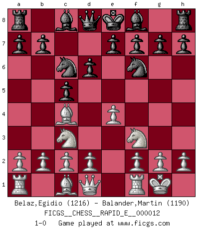 Last move : 1-0 2009 April 3 1:49:23 [Event "FICGS__CHESS__RAPID_E__000012"] [Site "FICGS"] [Date "2009.02.24"] [Round "1"] [White "Belaz,Egidio"] [Black "Balander,Martin"] [Result "1-0"] [WhiteElo "1216"] [BlackElo "1190"] 1.e4 c5 2.Nf3 d6 3.Bc4 Nf6 4.Nc3 Nc6 5.O-O 1-0 This chess game has been lost on time (started : 2009.02.24 16:4:57) Sicilian Kingside Castling by player White (move 5) Player White won this chess game. Follow this game move after move (download)The Pawns are the soul of the game. (Francois Andre Danican Philidor) Ich möchte Schüler heranbilden, die das Vermögen haben, selbst zu denken und Kritik zu üben. (Emanuel Lasker) Muchos jugadores de Ajedrez se sorprendían cuando después de la partida, Fischer explicaba con calma: 'Yo ya había analizado esta posibilidad' en una posición en la cual yo creía que no era posible de prever desde la apertura. (Mikhail Tal) Psychologiquement, tu dois avoir confiance en toi même, mais cette confiance doit être basée sur des faits. (Robert Fischer) A person who never made a mistake never tried anything new. (Albert Einstein)