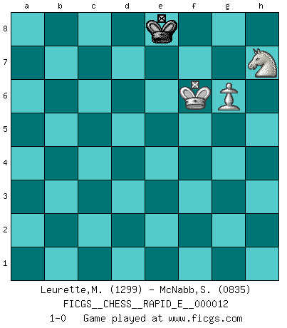 Last move : 1-0 2009 March 17 15:13:19 [Event "FICGS__CHESS__RAPID_E__000012"] [Site "FICGS"] [Date "2009.02.24"] [Round "1"] [White "Leurette,Marc-Antoine"] [Black "McNabb,Sean"] [Result "1-0"] [WhiteElo "1299"] [BlackElo "0835"] 1.e4 c5 2.Nc3 Nc6 3.Nf3 e5 4.Bc4 Nf6 5.Ng5 d5 6.exd5 Nd4 7.O-O Bg4 8.f3 Bf5 9.Bb5+ Nd7 10.d3 a6 11.Bxd7+ Qxd7 12.Qe1 f6 13.Nge4 Be7 14.f4 O-O 15.fxe5 fxe5 16.Bg5 Nxc2 17.Qh4 Bxg5 18.Nxg5 h6 19.Ne6 Bxe6 20.dxe6 Qxe6 21.Rac1 Rxf1+ 22.Rxf1 Ne3 23.Rf3 Nf5 24.Qe4 Rf8 25.Qxb7 Nh4 26.Rf2 Rxf2 27.Kxf2 Qf5+ 28.Kg3 Qf4+ 29.Kh3 g5 30.Qe4 Qxe4 31.Nxe4 Kf7 32.Nxc5 a5 33.Nb7 a4 34.b3 axb3 35.axb3 Nf5 36.Kg4 Kg6 37.b4 Nd4 38.Nd6 Nc6 39.b5 Nb8 40.Nc4 Nd7 41.b6 h5+ 42.Kf3 Kf5 43.h3 g4+ 44.hxg4+ hxg4+ 45.Ke3 Nc5 46.Nd6+ Ke6 47.b7 Nd7 48.Nb5 Kf5 49.d4 exd4+ 50.Nxd4+ Kg5 51.Ne6+ Kh4 52.Nc5 Nb8 53.Kf2 Kg5 54.g3 Kf5 55.Ke3 Ke5 56.Ne4 Kd5 57.Kf4 Kc6 58.Kxg4 Kxb7 59.Kf5 Nc6 60.g4 Ne7+ 61.Ke6 Ng6 62.g5 Kc7 63.Kf6 Nf4 64.Kf5 Nh5 65.g6 Ng7+ 66.Kf6 Nh5+ 67.Kf7 Kd8 68.Nf6 Ng7 69.Kxg7 Ke7 70.Nh7 Ke8 71.Kf6 1-0 Sicilian : Closed, 2...Nc6 Kingside Castling by player White (move 7) Kingside Castling by player Black (move 14) 10 pieces endgame at move 44 : White KNPPPP , Black KNPP WHITE : King + 1 Knight 4 Pawns BLACK : King + 1 Knight 2 Pawns 9 pieces endgame at move 44 : White KNPPP , Black KNPP WHITE : King + 1 Knight 3 Pawns BLACK : King + 1 Knight 2 Pawns 8 pieces endgame at move 49 : White KNPP , Black KNPP WHITE : King + 1 Knight 2 Pawns BLACK : King + 1 Knight 2 Pawns 7 pieces endgame at move 50 : White KNPP , Black KNP WHITE : King + 1 Knight 2 Pawns BLACK : King + 1 Knight 1 Pawn 6 pieces endgame at move 58 : White KNPP , Black KN WHITE : King + 1 Knight 2 Pawns BLACK : King + 1 Knight 5 pieces endgame at move 58 : White KNP , Black KN WHITE : King + 1 Knight 1 Pawn BLACK : King + 1 Knight 4 pieces endgame at move 69 : White KNP , Black K WHITE : King + 1 Knight 1 Pawn BLACK : King + Player White won this chess game. Follow this game move after move (download)Fischer is the strongest player in the world. In fact, the strongest player who ever lived. (Larry Evans) Wenn Du einsam bist, wenn Du Dich in der Welt wie ein Fremder fühlst, spiele Schach. Das wird Deinen Geist erheben und Dein Ratgeber im Kampf sein. (Aristoteles) El Ajedrez es tan interesante por sí solo, que no es necesario un interés monetario para persuadir a una persona a que lo practique; por lo tanto, nunca se juega por dinero. (Benjamin Franklin) Je fais ceci parce que dans cinquante coups j'obtiendrai cela; je m'appelle Mikhail Moisevitch Botvinnik. (Botvinnik) Life is pain my dear and anyone who says otherwise is selling something. (Princess Bride)