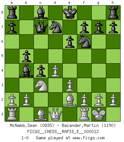 Last move : 1-0 2009 April 9 14:23:55 [Event "FICGS__CHESS__RAPID_E__000012"] [Site "FICGS"] [Date "2009.02.24"] [Round "1"] [White "McNabb,Sean"] [Black "Balander,Martin"] [Result "1-0"] [WhiteElo "0835"] [BlackElo "1190"] 1.d4 d5 2.c4 c6 3.Nc3 Nf6 4.Nf3 dxc4 5.e3 b5 6.Be2 e6 7.Ne5 Nbd7 8.Nxc6 Qc7 9.Nb4 Bxb4 10.O-O 1-0 This chess game has been lost on time (started : 2009.02.24 16:4:57) QGD Slav defense Kingside Castling by player White (move 10) Player White won this chess game. Follow this game move after move (download)Of all my Russian books, the defense contains and diffuses the greatest 'warmth' which may seem odd seeing how supremely abstract Chess is supposed to be. (Vladimir Nabokov) Die Fehler sind da, Sie warten nur darauf gemacht zu werden. (Savielly Grigorievitsch Tartakower) No puedes jugar al Ajedrez si eres de corazón noble. (Proverbio Francés) Je ne suis pas le dernier à jouer lâchement des coups douteux pendant le zeïtnot de l'adversaire pour l'achever: en effet les coups qui font le plus peur sont ceux que l'on ne comprend pas. Je me fais souvent peur quand je joue. (Un professeur anonyme) Life is like a ten-speed bicycle: most of us have gears we never use. (Charles M. Schulz)