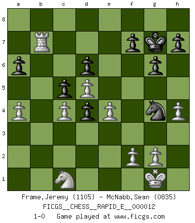 Last move : 1-0 2009 March 21 22:32:31 [Event "FICGS__CHESS__RAPID_E__000012"] [Site "FICGS"] [Date "2009.02.24"] [Round "1"] [White "Frame,Jeremy"] [Black "McNabb,Sean"] [Result "1-0"] [WhiteElo "1105"] [BlackElo "0835"] 1.e4 c5 2.Nf3 Nc6 3.c3 e5 4.d4 Nf6 5.d5 Ne7 6.Nbd2 d6 7.Bb5+ Nd7 8.b3 g6 9.Bb2 Bg7 10.a4 O-O 11.O-O Nf6 12.b4 b6 13.bxc5 bxc5 14.Qc2 Rb8 15.c4 a6 16.Bc6 Bb7 17.Bxb7 Rxb7 18.Ba3 Bh6 19.Rfb1 Qd7 20.Rxb7 Qxb7 21.Rb1 Qc7 22.Qb2 Rb8 23.Qxb8+ Qxb8 24.Rxb8+ Kg7 25.Rb7 Nc6 26.h4 Nd4 27.Nxd4 exd4 28.Bc1 Ng4 29.Nb3 Bxc1 30.Nxc1 1-0 Sicilian defense Kingside Castling by player Black (move 10) Kingside Castling by player White (move 11) Player White won this chess game. Follow this game move after move (download)I know people who have all the will in the world, but still can't play good Chess. (Bobby Fischer) Ich bin der einzige Schachspieler, der sich während der Vorbereitungen zum Turnier verletzt hat. (Woody Allen) No nos podemos resistir a la fascinación de un sacrificio ya que la pasión por los sacrificios es parte de la naturaleza de un jugador de Ajedrez. (Rudolf Spielman) Les échecs sont un jeu terrible. Si vous n'avez pas le centre, votre adversaire a une position plus libre. Par contre, si vous avez le centre, alors vous avez vraiment quelque chose pour laquelle vous inquiéter ! (Siegbert Tarrasch) Wisdom is the reward you get for a lifetime of listening when you'd have preferred to talk. (Doug Larson)