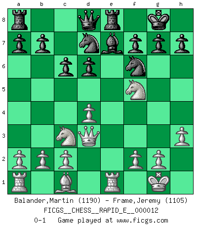 Last move : 0-1 2009 April 10 14:31:54 [Event "FICGS__CHESS__RAPID_E__000012"] [Site "FICGS"] [Date "2009.02.24"] [Round "1"] [White "Balander,Martin"] [Black "Frame,Jeremy"] [Result "0-1"] [WhiteElo "1190"] [BlackElo "1105"] 1.e4 e5 2.Nf3 Nf6 3.Nxe5 d6 4.Nf3 Nxe4 5.Nc3 Nf6 6.d4 c6 7.Bd3 Bg4 8.O-O Nbd7 9.h3 Bh5 10.Re1+ Be7 11.Qe2 Bg6 12.Nh4 Bxd3 13.Qxd3 O-O 14.Nf5 Re8 0-1 This chess game has been lost on time (started : 2009.02.24 16:4:57) Petrov : Nimzovich attack Kingside Castling by player White (move 8) Kingside Castling by player Black (move 13) Player Black won this chess game. Follow this game move after move (download)In order to improve your game, you must study the endgame before everything else, for whereas the endings can be studied and mastered by themselves, the middle game and the opening must be studied in relation to the endgame. (Jose Raul Capablanca) Ich weiss nicht was Gott gegen mich auf 1.e4 antworten würde. (Robert James Fischer) El Ajedrez es realmente noventa y nueve por ciento calculación. (Soltis) Des combinaisons [dans le jeu d'échecs] pareilles à des mélodies. Je crois entendre pour ainsi dire la musique des coups... (Vladimir Nabokov) Perception is reality. (Immanuel Kant)