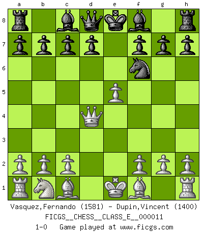 Last move : 1-0 2006 November 10 15:59:26 [Event "FICGS__CHESS__CLASS_E__000011"] [Site "FICGS"] [Date "2006.09.02"] [Round "1"] [White "Vasquez,Fernando"] [Black "Dupin,Vincent"] [Result "1-0"] [WhiteElo "1581"] [BlackElo "1400"] 1.e4 e5 2.Nf3 Nc6 3.d4 exd4 4.Nxd4 Nxd4 5.Qxd4 Nf6 6.e5 1-0 This chess game has been lost on time (started : 2006.09.02 12:53:40) Scotch game Player White won this chess game. Follow this game move after move (download)Fischer is under obligation to nobody. (Joseph Platz) Ein unbeabsichtigtes Patt ist der Gipfel der Dummheit. (Anonymous) El poder defensivo de una pieza clavada, solamente es imaginario. (Aaron Nimzovich) Mon pion favori sur ma case favorite ! Bronstein en parlant d'un coup de pion en h5 quand il avait les Noirs. I take risks, sometimes patients die, but not taking risks causes more patients to die. So I guess my biggest problem is I've been cursed with the ability to do the math. (Gregory House, House M.D.)