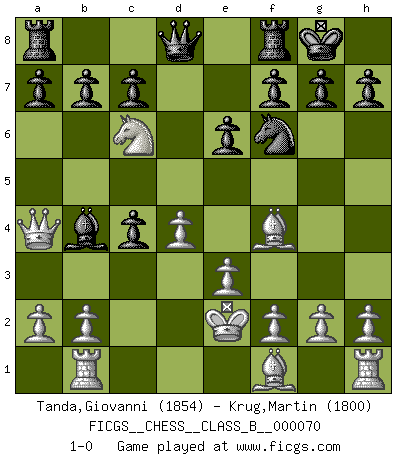 Last move : 1-0 2009 April 20 3:31:32 [Event "FICGS__CHESS__CLASS_B__000070"] [Site "FICGS"] [Date "2009.02.25"] [Round "1"] [White "Tanda,Giovanni"] [Black "Krug,Martin"] [Result "1-0"] [WhiteElo "1854"] [BlackElo "1800"] 1.d4 Nf6 2.Nf3 d5 3.Bf4 Bf5 4.e3 e6 5.c4 Bxb1 6.Rxb1 Bb4+ 7.Ke2 dxc4 8.Qa4+ Nc6 9.Ne5 O-O 10.Nxc6 1-0 This chess game has been lost on time (started : 2009.02.25 6:55:16) Queen's pawn game Kingside Castling by player Black (move 9) Player White won this chess game. Follow this game move after move (download)Fischer prefers to enter Chess history alone. (Miguel Najdorf) Wenn es im Universum noch irgendwo intelligente Lebewesen gibt, dann kennen sie Go. (Emanuel Lasker) Un entendimiento minucioso de las típicas continuaciones de mate hacen de las mas complicadas combinaciones de sacrificio que conducen hacia ellas no solo no dificiles, sino casi un asunto de rutina. (Siegbert Tarrasch) Une platitude souvent récitée à propos des Echecs est qu'une des choses les plus difficiles à réaliser est de gagner une position gagnante. Cela ne manque pas de sens mais, pour ma part, j'ai toujours trouvé plus difficile de gagner une position perdante. (Tim Krabbe) Luck is what you have left over after you give 100 percent. (Langston Coleman)