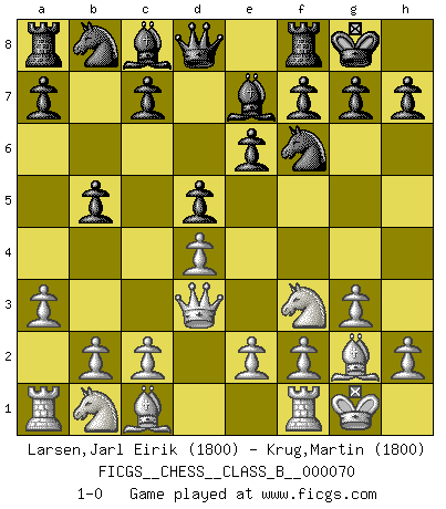 Last move : 1-0 2009 April 8 2:17:13 [Event "FICGS__CHESS__CLASS_B__000070"] [Site "FICGS"] [Date "2009.02.25"] [Round "1"] [White "Larsen,Jarl Eirik"] [Black "Krug,Martin"] [Result "1-0"] [WhiteElo "1800"] [BlackElo "1800"] 1.Nf3 Nf6 2.d4 e6 3.g3 d5 4.Bg2 Be7 5.O-O b5 6.Qd3 O-O 7.a3 1-0 This chess game has been lost on time (started : 2009.02.25 6:55:16) Reti Opening Kingside Castling by player White (move 5) Kingside Castling by player Black (move 6) Player White won this chess game. Follow this game move after move (download)In a gambit you give up a Pawn for the sake of getting a lost game. (Samuel Standige Boden) Ich trinke, ich rauche, ich spiele, ich liebe Frauen aber Fernschach ist ein Laster, das ich nicht habe. (Mikhail Nekhemyevich Tal) El Ajedrez es un regaderazo frío para la mente. (Sir John Simon) D'abord les bases : Jouez et étudiez, puis étudiez et jouez, ensuite jouez et étudiez, puis étudiez et jouez. Deuxièmement : Donnez toujours le meilleur de vous-même ! (Ken Smith) Don't be irreplaceable, if you can't be replaced, you can't be promoted. (Dan Rotaru)