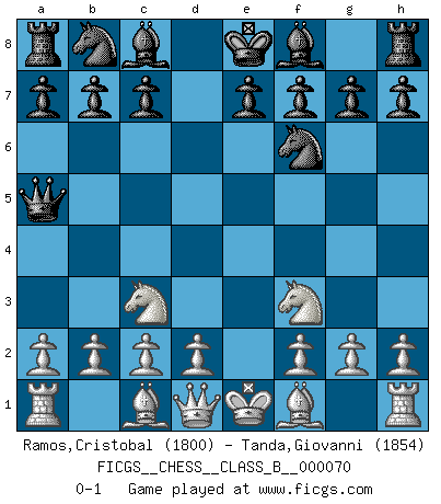 Last move : 0-1 2009 April 9 2:23:45 [Event "FICGS__CHESS__CLASS_B__000070"] [Site "FICGS"] [Date "2009.02.25"] [Round "1"] [White "Ramos,Cristobal"] [Black "Tanda,Giovanni"] [Result "0-1"] [WhiteElo "1800"] [BlackElo "1854"] 1.e4 d5 2.exd5 Qxd5 3.Nc3 Qa5 4.Nf3 Nf6 0-1 This chess game has been lost on time (started : 2009.02.25 6:55:16) Scandinavian (centre counter) defense Player Black won this chess game. Follow this game move after move (download)That's what Chess is all about. One day you give your opponent a lesson, the next day he gives you one. (Bobby Fischer) Die Fehler sind da, Sie warten nur darauf gemacht zu werden. (Savielly Grigorievitsch Tartakower) Hay dos clases de hombres: aquellos que se conforman en dejarse llevar por las circunstancias y que juegan barajas y aquellos decididos a controlar las circunstancias y que juegan al Ajedrez. (Mortimer Collins) Un journaliste : 'Vous préférez avoir une dame de plus sur l'échiquier ou au lit ?' Boris Spassky : 'Ca dépend de la position.' 'preceded by its own quotation yields a falsehood' preceded by its own quotation yields a falsehood. (W. V. O. Quine - Set Theory And Its Logic, 1953)