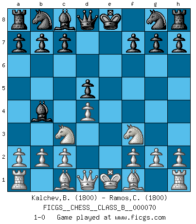 Last move : 1-0 2009 April 8 14:18:6 [Event "FICGS__CHESS__CLASS_B__000070"] [Site "FICGS"] [Date "2009.02.25"] [Round "1"] [White "Kalchev,Borislav"] [Black "Ramos,Cristobal"] [Result "1-0"] [WhiteElo "1800"] [BlackElo "1800"] 1.e4 e6 2.d4 d5 3.Nc3 Bb4 4.exd5 exd5 5.Nf3 1-0 This chess game has been lost on time (started : 2009.02.25 6:55:16) French : Winawer (Nimzovich) variation Player White won this chess game. Follow this game move after move (download)A chess genius has died; a loss for humanity. (Viktor Kortchnoi, about Bobby Fischer's death) Mein Gehirn das ist mein zweitwichtigstes Organ [Aus dem Film: Der Schläfer]. (Woody Allen) Si tu oponente no puede hacer nada activo, entonces no apures la posición; En vez de eso, dejalo estar sentado ahí, sufriendo y rogandote por un empate. (Jeremy Silman) Les échecs, c'est la lutte contre l'erreur. (Johannes Zukertort) Your best chance to get a Royal Flush in a casino is in the bathroom. (Anonymous)