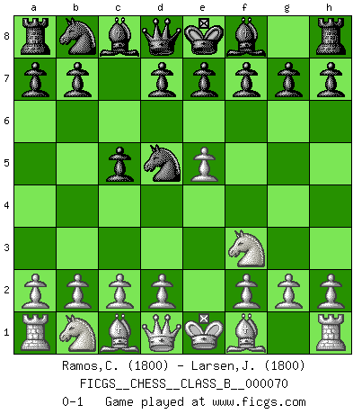 Last move : 0-1 2009 April 9 14:23:55 [Event "FICGS__CHESS__CLASS_B__000070"] [Site "FICGS"] [Date "2009.02.25"] [Round "1"] [White "Ramos,Cristobal"] [Black "Larsen,Jarl Eirik"] [Result "0-1"] [WhiteElo "1800"] [BlackElo "1800"] 1.e4 c5 2.Nf3 Nf6 3.e5 Nd5 0-1 This chess game has been lost on time (started : 2009.02.25 6:55:16) Sicilian : Nimzovich-Rubinstein variation Player Black won this chess game. Follow this game move after move (download)In Chess, just as in life, today's bliss may be tomorrow's poison. (Assaic) Mit Schach schule ich mein Gefühl für Geometrie, was für Tennis und Schach gleichermaßen wichtig ist. (Boris Becker) Cuando tu no sabes absolutamente que mas hacer, es tiempo de entrar en pánico. (John van der Wiel) Même un GMI sait rarement calculer sur plus de cinq coups une attaque à sacrifices. (Rudolf Spielmann) I find television to be very educating. Every time somebody turns on the set, I go in the other room and read a book. (Groucho Marx)