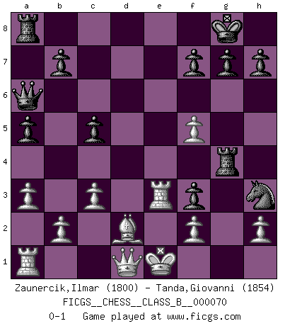 Last move : 0-1 2009 May 19 19:0:25 [Event "FICGS__CHESS__CLASS_B__000070"] [Site "FICGS"] [Date "2009.02.25"] [Round "1"] [White "Zaunercik,Ilmar"] [Black "Tanda,Giovanni"] [Result "0-1"] [WhiteElo "1800"] [BlackElo "1854"] 1.e4 d5 2.exd5 Qxd5 3.Nc3 Qa5 4.d4 Nf6 5.Bd2 c6 6.Nf3 Bf5 7.Bc4 e6 8.O-O Bb4 9.a3 Bxc3 10.Bxc3 Qc7 11.Re1 O-O 12.Bb4 Rd8 13.Ne5 a5 14.Bc3 c5 15.d5 Nxd5 16.Bd2 Nc6 17.Nxc6 Qxc6 18.Be2 e5 19.Bf3 e4 20.g4 exf3 21.gxf5 Nf4 22.Re3 Rd4 23.c3 Nh3+ 24.Kf1 Qa6+ 25.Ke1 Rg4 0-1 Scandinavian (centre counter) defense Kingside Castling by player White (move 8) Kingside Castling by player Black (move 11) Player Black won this chess game. Follow this game move after move (download)Chess is life. (Bobby Fischer) Stil? Ich habe keinen Stil! (Anatoly Karpov) En la vida, como en el Ajedrez, los Peones propios obstruyen nuestro camino. La gran fortuna de un hombre, su comodidad, placer, hijos, libros, que deberían ayudarle a ganar, con mucha frecuencia lo ponen en Jaque Mate. (Charles Buxton) Même si l'adversaire joue le coup analysé précédemment, recommencez l'analyse en voyant la nouvelle position. Première règle de Blumenfeld A good programmer is someone who always looks both ways before crossing a one-way street. (Doug Linder)
