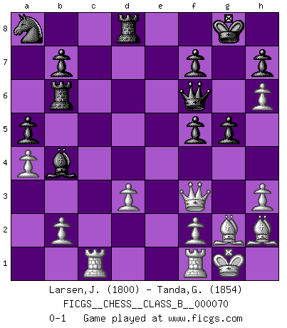 Last move : 0-1 2009 June 24 20:43:1 [Event "FICGS__CHESS__CLASS_B__000070"] [Site "FICGS"] [Date "2009.02.25"] [Round "1"] [White "Larsen,Jarl Eirik"] [Black "Tanda,Giovanni"] [Result "0-1"] [WhiteElo "1800"] [BlackElo "1854"] 1.Nf3 d5 2.g3 Bf5 3.d3 Nf6 4.Bg2 e6 5.c4 c6 6.O-O Be7 7.Nh4 Bg4 8.h3 Bh5 9.g4 Nfd7 10.cxd5 cxd5 11.Nf5 exf5 12.gxh5 Nb6 13.a4 a5 14.Qb3 Nc6 15.Be3 d4 16.Bf4 O-O 17.Na3 Bb4 18.Nc2 Re8 19.e3 Qf6 20.h6 g5 21.Bc7 Ra6 22.Rac1 Na8 23.Bh2 Rb6 24.Qd5 Rd8 25.Qf3 Bd2 26.Rcd1 Bb4 27.exd4 Nxd4 28.Nxd4 Rxd4 29.Rc1 Rd8 0-1 Reti : King's Indian attack (Barcza system) Kingside Castling by player White (move 6) Kingside Castling by player Black (move 16) Player Black won this chess game. Follow this game move after move (download)If your opponent offers you a draw, try to work out why he thinks he's worse off. (Nigel Short) Wie, soll nun auch die Opposition abgeschafft werden? Ja, es tut mir leid, Ihnen diesen Schmerz nicht ersparen zu können. (Aaron Nimzowitsch) No hay precio que sea tan grande por la cabellera del Rey enemigo. (Koblentz) J'ai vu le vaincu d'Echecs jouer des années durant dans l'espoir de la fête de la victoire. Car tu es plus riche de ce qu'elle existe si même elle n'est point pour toi. Ainsi de la perle du fond des mers. (Antoine de Saint-Exupéry) Mandala - that's it! 16x16 squares as multiple of the four and the eight because of the Four Noble Truths and the Noble Eightfold Path. (Heinz-Georg Lehnhoff about Big Chess)