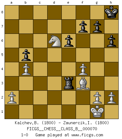 Last move : 1-0 2009 August 10 12:54:55 [Event "FICGS__CHESS__CLASS_B__000070"] [Site "FICGS"] [Date "2009.02.25"] [Round "1"] [White "Kalchev,Borislav"] [Black "Zaunercik,Ilmar"] [Result "1-0"] [WhiteElo "1800"] [BlackElo "1800"] 1.d4 d5 2.c4 e6 3.Nc3 Nf6 4.Bg5 c6 5.Bxf6 Qxf6 6.e3 Bb4 7.Nf3 Nd7 8.Qb3 Be7 9.Bd3 O-O 10.O-O dxc4 11.Qxc4 Nb6 12.Qb3 Nd5 13.Rfe1 b6 14.Ne5 Nxc3 15.Qxc3 c5 16.Qc2 Qh6 17.Be4 Rb8 18.f4 Bd6 19.Nc6 Rb7 20.dxc5 Bxc5 21.b4 Bd6 22.Red1 Rd7 23.Rxd6 Rxd6 24.Ne7+ Kh8 25.Nxc8 Rd7 26.Qc3 Qh4 27.Bf3 Qd8 28.Rc1 Rd3 29.Qc7 Rxe3 30.Qxd8 Rxd8 31.Nxa7 h6 32.Rc8 Rxc8 33.Nxc8 b5 34.Nd6 1-0 QGD : 4.Bg5 Kingside Castling by player Black (move 9) Kingside Castling by player White (move 10) Player White won this chess game. Follow this game move after move (download)Many Chess players were surprised when after the game, Fischer quietly explained: 'I had already analyzed this possibility' in a position which I thought was not possible to foresee from the opening. (Mikhail Tal) Pläne sind die Träume des Verständigen. (Ernst Freiherr von Feuchtersleben) Todavía soy una víctima del Ajedrez. Tiene toda la belleza del arte y mucho mas. No puede ser comercializado. El Ajedrez es mas puro que el arte en su posición social. (Marcel Duchamp) On a dit que l'homme se distingue de l'animal par le fait qu'il achète plus de livres qu'il ne peut en lire. Je voudrais suggérer qu'inclure à la liste des livres quelques livres d'échecs rendrait la distinction manifeste. (Edward Lasker) It's only after you lost everything, Tyler says, that you're free to do anything. (Chuck Palahniuk, Fight Club)