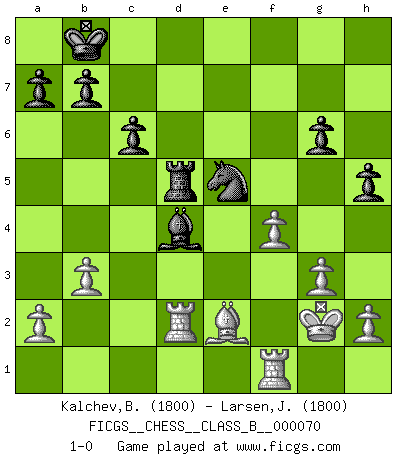 Last move : 1-0 2009 June 14 20:3:28 [Event "FICGS__CHESS__CLASS_B__000070"] [Site "FICGS"] [Date "2009.02.25"] [Round "1"] [White "Kalchev,Borislav"] [Black "Larsen,Jarl Eirik"] [Result "1-0"] [WhiteElo "1800"] [BlackElo "1800"] 1.e4 Nf6 2.e5 Nd5 3.d4 d6 4.Nf3 Bg4 5.Be2 c6 6.c4 Nb6 7.Nbd2 dxe5 8.Nxe5 Bf5 9.Ndf3 f6 10.c5 fxe5 11.cxb6 Qxb6 12.Nxe5 Nd7 13.Nc4 Qc7 14.O-O O-O-O 15.g3 Kb8 16.Bf4 e5 17.dxe5 Be6 18.Bg5 Bc5 19.Bxd8 Rxd8 20.Qc2 Nxe5 21.Rad1 Bd4 22.Qe4 Bxc4 23.Bxc4 Qb6 24.b3 h5 25.Be2 g6 26.Kg2 Qc5 27.Rd2 Qd5 28.Qxd5 Rxd5 29.f4 1-0 Alekhine's defense : Modern, Flohr variation Kingside Castling by player White (move 14) Queenside Castling by player Black (move 14) Player White won this chess game. Follow this game move after move (download)Of Chess it has been said that life is not long enough for it, but that is the fault of life, not Chess. (William Ewart Napier) Schach ist eine Sache der genauen Beurteilung, wann man zuschlagen und wann man sich ducken muss. (Robert James Fischer) Fischer no está bajo la obligación de nadie. (Joseph Platz) Le succès, c'est être capable d'aller d'échec en échec sans perdre son enthousiasme. (Winston Churchill) In theory there is no difference between theory and practice. In practice there is. (Yogi Berra)