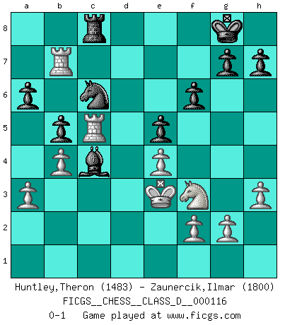 Last move : 0-1 2009 March 13 20:21:46 [Event "FICGS__CHESS__CLASS_D__000116"] [Site "FICGS"] [Date "2009.02.25"] [Round "1"] [White "Huntley,Theron"] [Black "Zaunercik,Ilmar"] [Result "0-1"] [WhiteElo "1483"] [BlackElo "1800"] 1.d4 d5 2.c4 e6 3.Nf3 Nf6 4.Nc3 Be7 5.Bf4 O-O 6.e3 c5 7.dxc5 Bxc5 8.a3 Bd6 9.Bxd6 Qxd6 10.Be2 Rd8 11.O-O Nc6 12.Qd3 e5 13.cxd5 Nxd5 14.Rfd1 Nce7 15.e4 Nxc3 16.Qxd6 Nxe2+ 17.Kf1 Rxd6 18.Rxd6 Nc6 19.Kxe2 Bg4 20.Ke3 Rc8 21.b4 a6 22.Rc1 f6 23.h3 Bh5 24.Rd7 b5 25.Rb7 Bf7 26.Rc5 Bc4 0-1 Queen's gambit declined Kingside Castling by player Black (move 5) Kingside Castling by player White (move 11) Player Black won this chess game. Follow this game move after move (download)Discovered check is the dive bomber of the Chessboard. (Reuben Fine) Obwohl ich alt bin, darf mir niemand den Finger in den Mund stecken, sonst beisse ich. (Wilhelm Steinitz) El estómago es una parte esencial del maestro de Ajedrez. (Bent Larsen) On n'a jamais que l'âge auquel on a commence à jouer aux échecs car après on cesse de vieillir. (Capablanca) You must do what you feel is right... of course. (Obi-Wan Kenobi in Star Wars ep.4)