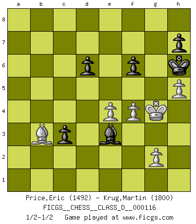 Last move : 1/2-1/2 2009 May 7 2:14:32 [Event "FICGS__CHESS__CLASS_D__000116"] [Site "FICGS"] [Date "2009.02.25"] [Round "1"] [White "Price,Eric"] [Black "Krug,Martin"] [Result "1/2-1/2"] [WhiteElo "1492"] [BlackElo "1800"] 1.e4 e5 2.Nf3 Nc6 3.Bb5 Nd4 4.Nxd4 exd4 5.O-O Bc5 6.Bc4 d6 7.d3 Nf6 8.Bg5 O-O 9.Qf3 Be6 10.Bxf6 Qxf6 11.Qxf6 gxf6 12.Nd2 a6 13.a4 f5 14.exf5 Bxf5 15.c3 c6 16.Ne4 Bxe4 17.dxe4 dxc3 18.bxc3 b5 19.axb5 axb5 20.Be2 b4 21.cxb4 Bxb4 22.Bf3 Rfb8 23.h4 Bc5 24.Rxa8 Rxa8 25.Kh2 Ra2 26.Kg3 Kg7 27.h5 f6 28.Bg4 Bd4 29.f4 c5 30.Be6 Ra3+ 31.Kg4 Re3 32.Bd5 c4 33.Rf3 c3 34.Rxe3 Bxe3 35.Bb3 Kh6 1/2-1/2 Ruy Lopez : Bird's defense Kingside Castling by player White (move 5) Kingside Castling by player Black (move 8) This chess game ended in a draw. Follow this game move after move (download)The combination player thinks forward; he starts from the given position, and tries the forceful moves in his mind. (Emanuel Lasker) Es ist im Leben wie im Schachspiel. Wir entwerfen einen Plan, dieser bleibt jedoch bedingt durch das, was im Schachspiel dem Gegner, im Leben dem Schicksal zu tun belieben wird. (Arthur Schopenhauer) En el Ajedrez, tal como es jugado por los Maestros, practicamente la suerte es eliminada. (Emanuel Lasker) Je menace de comprendre la position. (Anonyme) When you stop learning you start dying. (Scott Adams)