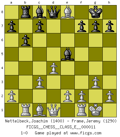 Last move : 1-0 2006 September 9 19:50:10 [Event "FICGS__CHESS__CLASS_E__000011"] [Site "FICGS"] [Date "2006.09.02"] [Round "1"] [White "Nettelbeck,Joachim"] [Black "Frame,Jeremy"] [Result "1-0"] [WhiteElo "1400"] [BlackElo "1290"] 1.c4 e5 2.g3 Nc6 3.Nc3 Nf6 4.Nf3 d5 5.cxd5 Nxd5 6.Bg2 Nxc3 7.bxc3 Bd6 8.O-O O-O 9.Rb1 Re8 10.d4 b6 11.Nxe5 Bxe5 12.Bxc6 Rb8 13.Bxe8 1-0 English Opening Kingside Castling by player White (move 8) Kingside Castling by player Black (move 8) Player White won this chess game. Follow this game move after move (download)You cannot play at Chess if you are kind-hearted. (French Proverb) Alles was ich jemals tun will ist Schach spielen. (Robert James Fischer) No existe un remordimiento como el remordimiento del Ajedrez. (H. G. Wells) La solitude du joueur d'Echecs à l'approche du mat est semblable à celle du condamné. (Francis Szpiner) If you know the enemy and know yourself you need not fear the results of a hundred battles. (Sun Tzu)