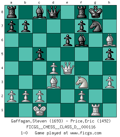 Last move : 1-0 2009 May 22 5:39:6 [Event "FICGS__CHESS__CLASS_D__000116"] [Site "FICGS"] [Date "2009.02.25"] [Round "1"] [White "Gaffagan,Steven"] [Black "Price,Eric"] [Result "1-0"] [WhiteElo "1693"] [BlackElo "1492"] 1.e4 e6 2.d4 d5 3.Nc3 dxe4 4.Nxe4 Nd7 5.Nf3 Ngf6 6.Bd3 Be7 7.Nxf6+ Nxf6 8.Qe2 h6 9.Bd2 O-O 10.O-O-O c5 11.g4 Nxg4 12.Rhg1 h5 13.h3 Nf6 14.Bh6 Ne8 15.Rxg7+ Nxg7 16.Rg1 Bf6 17.Qe4 1-0 French : Rubinstein variation Kingside Castling by player Black (move 9) Queenside Castling by player White (move 10) Player White won this chess game. Follow this game move after move (download)After a bad opening, there is hope for the middle game. After a bad middle game, there is hope for the endgame. But once you are in the endgame, the moment of truth has arrived. (Edmar Mednis) Der Traum, für den ich lebe, ist der von einem freien Russland. Viele mögen sagen: Russland hat doch ein Parlament, einen gewählten Präsidenten. Aber ich spüre, dass in meiner Heimat die Angst wiederkehrt. Eine Angst, sich frei zu äußern, bestimmte Dinge zu tun (Garry Kasparov) Los Peones son el alma de una partida de Ajedrez. (Francois Andre Danican Philidor) Les Echecs mettent en conflit, non pas deux intelligences, mais deux volontés. (Lasker) Memory is a complicated thing, a relative to truth, but not its twin. (Barbara Kingsolver, Animal Dreams)