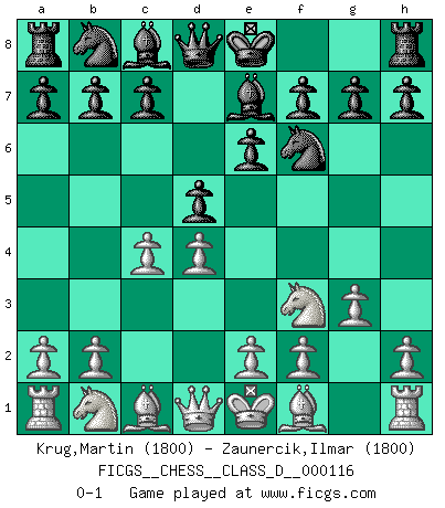 Last move : 0-1 2009 April 8 14:18:6 [Event "FICGS__CHESS__CLASS_D__000116"] [Site "FICGS"] [Date "2009.02.25"] [Round "1"] [White "Krug,Martin"] [Black "Zaunercik,Ilmar"] [Result "0-1"] [WhiteElo "1800"] [BlackElo "1800"] 1.d4 d5 2.Nf3 Nf6 3.c4 e6 4.g3 Be7 0-1 This chess game has been lost on time (started : 2009.02.25 23:24:59) Queen's pawn game Player Black won this chess game. Follow this game move after move (download)In Chess, as it is played by masters, chance is practically eliminated. (Emanuel Lasker) Karpov ist ein Museumsstück. (Garry Kasparov) El tablero es el mundo, las piezas es el fenomeno del universo, las reglas del juego son lo que llamamos leyes de la naturaleza y el jugador del lado opuesto, se encuentra oculto a nuestra vista. (Thomas Huxley) Les échecs sont un jeu terrible. Si vous n'avez pas le centre, votre adversaire a une position plus libre. Par contre, si vous avez le centre, alors vous avez vraiment quelque chose pour laquelle vous inquiéter ! (Siegbert Tarrasch) If things go wrong, don't go with them. (Roger Babson)