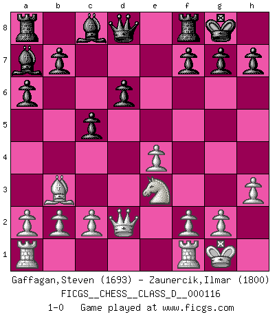 Last move : 1-0 2009 August 9 0:43:47 [Event "FICGS__CHESS__CLASS_D__000116"] [Site "FICGS"] [Date "2009.02.25"] [Round "1"] [White "Gaffagan,Steven"] [Black "Zaunercik,Ilmar"] [Result "1-0"] [WhiteElo "1693"] [BlackElo "1800"] 1.e4 e5 2.Nf3 Nc6 3.d4 exd4 4.Nxd4 Bc5 5.Be3 Bb6 6.Nc3 Nf6 7.Bc4 O-O 8.O-O d6 9.h3 a6 10.Bb3 Nxd4 11.Bxd4 c5 12.Bxf6 Qxf6 13.Nd5 Qd8 14.Qd2 Ba7 15.Ne3 1-0 This chess game has been lost on time (started : 2009.02.25 23:24:59) Scotch game Kingside Castling by player Black (move 7) Kingside Castling by player White (move 8) Player White won this chess game. Follow this game move after move (download)Good offense and good defense both begin with good development. (Bruce A. Moon) Besser ein falscher Plan, logisch durchgeführt, als gar kein Plan. (Viktor Kortschnoi) Tu no necesitas jugar muy bien, únicamente ayudar a tu oponenet a que juegue muy mal. (Genrikh Chepukaitis) Les réformistes prétendent que les progrès de la théorie conduiront à la disparition des échecs, et qu'il faut, pour leur rendre vie, en remanier les règles. En réalité, qu'exprime cette affirmation? Le mépris de l'intuition, de l'imagination et de tous les autres éléments qui font des échecs un art. (Alexander Alekhine) A good book on your shelf is a friend that turns its back on you and remains a friend. (Author unknown)