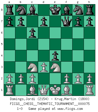 Last move : 1-0 2009 April 8 14:18:6 [Event "FICGS__CHESS__THEMATIC_TOURNAMENT__000075"] [Site "FICGS"] [Date "2009.02.26"] [Round "1"] [White "Domingo,Jordi"] [Black "Krug,Martin"] [Result "1-0"] [WhiteElo "2154"] [BlackElo "1800"] 1.e4 e5 2.Nf3 f5 3.Nxe5 Qf6 4.Nc4 fxe4 5.Nc3 Qf7 6.Ne3 c6 7.d3 1-0 This chess game has been lost on time (started : 2009.02.26 1:54:5) Latvian counter-gambit Player White won this chess game. Follow this game move after move (download)Bobby Fischer is the greatest Chess player who has ever lived. (Ken Smith) Jeder Fehler erscheint unglaublich dumm, wenn andre ihn begehen. (Georg Christoph Lichtenberg) Tu eres para mi la Reina en d8 y yo soy el Peón en d7!!. (GM Eduard Gufeld) On n'a jamais que l'âge auquel on a commence à jouer aux échecs car après on cesse de vieillir. (Capablanca) Good luck. You're gonna need it. (Han Solo in Star Wars ep.6)