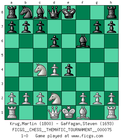 Last move : 1-0 2009 April 28 16:20:0 [Event "FICGS__CHESS__THEMATIC_TOURNAMENT__000075"] [Site "FICGS"] [Date "2009.02.26"] [Round "1"] [White "Krug,Martin"] [Black "Gaffagan,Steven"] [Result "1-0"] [WhiteElo "1800"] [BlackElo "1693"] 1.e4 e5 2.Nf3 f5 3.d4 fxe4 4.Nxe5 Nf6 5.Bg5 d6 6.Nc4 Be7 7.Bxf6 Bxf6 8.Nbd2 1-0 This chess game has been lost on time (started : 2009.02.26 1:54:5) Latvian counter-gambit Player White won this chess game. Follow this game move after move (download)I'd rather have a Pawn than a finger. (Reuben Fine) Ein Gewinn durch eine ungenaue Kombination, sei sie auch noch so vorzeigbar, erfüllt mich mit Schaudern. (Wilhelm Steinitz) El jugador blanco perdió porque fallo en recordar la coreccta continuación y tuvo que pensar por sí mismo las movidas. (Siegbert Tarrasch) Le jeu d'échecs fait naître et fortifie en nous plusieurs qualités précieuses dans le cours de l'existence, telles que la prévoyance, la circonspection, la prudence, et la persévérance. (Benjamin Franklin - 1783, la morale des échecs) Perhaps the current trend of many chess professionals taking up the more lucrative pastime of poker is not a wholly negative one. It may not be too late for humans to relearn how to take risks in order to innovate and thereby maintain the advanced lifestyles we enjoy. And if it takes a poker-playing supercomputer to remind us that we can't enjoy the rewards without taking the risks, so be it. (The Chess Master and the Computer, by Garry Kasparov - 2010)