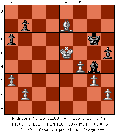 Last move : 1/2-1/2 2009 June 17 17:21:54 [Event "FICGS__CHESS__THEMATIC_TOURNAMENT__000075"] [Site "FICGS"] [Date "2009.02.26"] [Round "1"] [White "Andreoni,Mario"] [Black "Price,Eric"] [Result "1/2-1/2"] [WhiteElo "1800"] [BlackElo "1492"] 1.e4 e5 2.Nf3 f5 3.Nxe5 Qf6 4.Nc4 fxe4 5.Nc3 Qe6 6.d3 exd3 7.Ne3 dxc2 8.Qxc2 Nf6 9.Bc4 d5 10.Bxd5 Nxd5 11.Ncxd5 Bd6 12.Nxc7+ Bxc7 13.Qxc7 O-O 14.O-O Na6 15.Qc4 Qxc4 16.Nxc4 Bd7 17.Be3 Nb4 18.Bc5 Rfc8 19.Bxb4 Rxc4 20.Bc3 Rf8 21.f3 Bb5 22.Rfe1 Kf7 23.Re5 a6 24.Rae1 Re8 25.Rxe8 Bxe8 26.Bxg7 Bc6 27.Bc3 Ra4 28.a3 Rh4 29.g3 Rh6 30.f4 Bd7 31.Bb4 Re6 32.Rxe6 Bxe6 33.Kf2 Kg6 34.Kf3 h5 35.Ke4 Bg4 36.Ke5 Bf5 37.Be7 Bg4 1/2-1/2 Latvian counter-gambit Kingside Castling by player Black (move 13) Kingside Castling by player White (move 14) This chess game ended in a draw. Follow this game move after move (download)Chess is a fairy tale of 1001 blunders. (Savielly Tartakower) Schach ist wie eine schöne Frau, zu der wir ständig zurückkehren, gleichviel, wie oft sie uns zurückweist. (Anonymous) Un juego de Ajedrez es un dialogo, una conversación entre un jugador y su oponente. Cada movimiento del oponente puede contener amenazas o tropiezos, pero un jugador no se puede defender de las amenazas o tomar ventaja de los tropiezos si es que no se pregunta a sí mismo: ¿Que es lo que mi oponente va a hacer después de cada movida?. (Bruce A. Moon) Mais n'est-ce pas déjà le limiter injurieusement que d'appeler les échecs un jeu? N'est-ce pas aussi une science, un art, ou quelque chose qui, comme le cercueil de Mahomet entre ciel et terre, est suspendu entre l'un et l'autre, et qui réunit un nombre incroyable de contraires ? (Stefan Zweig) To err is human, but to really foul things up requires a computer. (Farmer's Almanac, 1978)