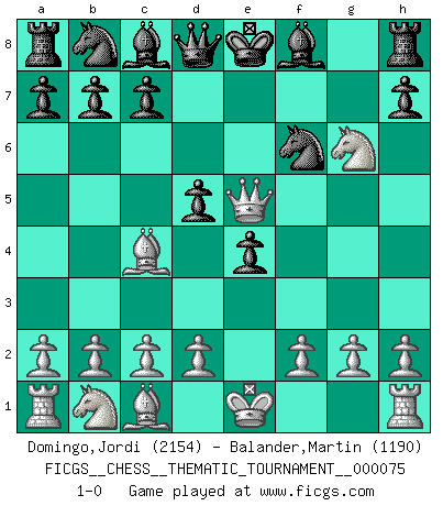 Last move : 1-0 2009 April 8 2:17:13 [Event "FICGS__CHESS__THEMATIC_TOURNAMENT__000075"] [Site "FICGS"] [Date "2009.02.26"] [Round "1"] [White "Domingo,Jordi"] [Black "Balander,Martin"] [Result "1-0"] [WhiteElo "2154"] [BlackElo "1190"] 1.e4 e5 2.Nf3 f5 3.Bc4 fxe4 4.Nxe5 d5 5.Qh5+ g6 6.Nxg6 Nf6 7.Qe5+ 1-0 This chess game has been lost on time (started : 2009.02.26 1:54:5) Latvian : Polerio variation Player White won this chess game. Follow this game move after move (download)In complicated positions, Bobby Fischer hardly had to be afraid of anybody. (Paul Keres) Viele Opfer benötigen überhaupt keine konkrete Berechnung. Es genügt sich die entstehende Position kurz vorzustellen, um uns davon zu überzeugen, dass das Opfer korrekt ist. (Mikhail Nekhemyevich Tal) El Ajedrez es un mar en el cual un mosquito puede beber y un elefante puede bañarse. (Refrán Hindú) Il n'y a pas eu de défaite parce que je ne crois pas que cet ordinateur ait jamais existé. IBM a triché en refusant d'imprimer les modes de recherche de la machine. C'est évident, pendant le match, des coups décisifs ont été joués par des êtres humains. Aujourd'hui, les meilleurs spécialistes en informatique ne peuvent toujours pas expliquer comment Deep-Blue a pu jouer contre la logique des ordinateurs. IBM a gagné une guerre de communication, mais ils sont incapables de prouver que l'ordinateur a gagné tout seul. (Garry Kasparov) The smarter you play, the luckier you'll be. (Mark Pilarski)