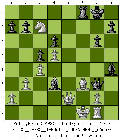 Last move : 0-1 2009 May 10 6:12:43 [Event "FICGS__CHESS__THEMATIC_TOURNAMENT__000075"] [Site "FICGS"] [Date "2009.02.26"] [Round "1"] [White "Price,Eric"] [Black "Domingo,Jordi"] [Result "0-1"] [WhiteElo "1492"] [BlackElo "2154"] 1.e4 e5 2.Nf3 f5 3.Nxe5 Qf6 4.d4 d6 5.Nc4 fxe4 6.Nc3 Qg6 7.Ne3 Nf6 8.Be2 c6 9.O-O Be7 10.f3 exf3 11.Bxf3 O-O 12.d5 c5 13.Nb5 Na6 14.c4 Nd7 15.Bh5 Rxf1+ 16.Nxf1 Qf6 17.Ng3 Ne5 18.Ne4 Qf8 19.b3 Bf5 20.Ng5 Qf6 21.Be3 Qh6 22.h4 Rf8 23.Bd2 g6 24.Be2 Qxh4 25.Nf3 Nxf3+ 26.Bxf3 Nb4 27.Be1 Qh6 28.Bg3 Bg5 29.Qe2 Nd3 30.Bf2 Nxf2 31.Kxf2 Qh2 32.Rg1 Bh4+ 33.Kf1 Qg3 34.Nc7 Bd3 0-1 Latvian counter-gambit Kingside Castling by player White (move 9) Kingside Castling by player Black (move 11) Player Black won this chess game. Follow this game move after move (download)Play the opening like a book, the middle game like a magician, and the endgame like a machine. (Spielmann) Moralische Siege zählen nicht. (Savielly Grigorievitsch Tartakower) El hombre es un frívolo, una creatura engañosa y como un jugador de Ajedrez, se preocupa mas por el proceso de obtener su meta que de la meta por sí misma. (Dostoyevsky) Nous vivons dans un monde échiquéen : chaque jour qui passe est un défi à relever. (Philosophe Sasha) I teach you to lie, cheat and steal, and as soon as my back's turned you wait in line ? (Gregory House, House M.D.)