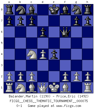 Last move : 0-1 2009 April 8 2:17:13 [Event "FICGS__CHESS__THEMATIC_TOURNAMENT__000075"] [Site "FICGS"] [Date "2009.02.26"] [Round "1"] [White "Balander,Martin"] [Black "Price,Eric"] [Result "0-1"] [WhiteElo "1190"] [BlackElo "1492"] 1.e4 e5 2.Nf3 f5 3.Nxe5 Qf6 4.d4 d6 5.Nc4 fxe4 0-1 This chess game has been lost on time (started : 2009.02.26 1:54:5) Latvian counter-gambit Player Black won this chess game. Follow this game move after move (download)When you don't know what to play, wait for an idea to come into your opponent's mind. You may be sure that idea will be wrong. (Siegbert Tarrasch) Ohne Fehler kann es keine Brillanz geben. (Emanuel Lasker) Jugadores de primera clase pierden en contra de jugadores de segunda clase porque los jugadores de segunda clase a veces juegan una partida de primer clase. (Siegbert Tarrasch) Avant la finale, les dieux ont créé le milieu de partie. (Tarrasch) Real knowledge is to know the extent of one's ignorance. (Confucius)