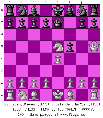 Last move : 1-0 2009 May 9 17:25:11 [Event "FICGS__CHESS__THEMATIC_TOURNAMENT__000075"] [Site "FICGS"] [Date "2009.02.26"] [Round "1"] [White "Gaffagan,Steven"] [Black "Balander,Martin"] [Result "1-0"] [WhiteElo "1693"] [BlackElo "1190"] 1.e4 e5 2.Nf3 f5 3.Nxe5 Qe7 4.Qh5+ 1-0 This chess game has been lost on time (started : 2009.02.26 1:54:5) Latvian counter-gambit Player White won this chess game. Follow this game move after move (download)The beauty of a move lies not in its' appearance but in the thought behind it. (Siegbert Tarrasch) Bobby Fischer ist kein Vorbild für die heutige Jugend. (Viktor Kortschnoi) No todos los artistas son jugadores de Ajedrez, pero todos los jugadores de Ajedrez son artistas. (Marcel Duchamp) La tactique est l'élément le plus important du milieu de jeu. (Siegbert Tarrasch) No, I am still playing. (Anatoly Karpov)