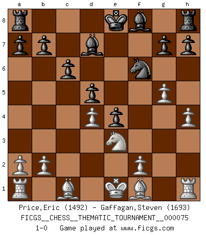 Last move : 1-0 2009 June 5 19:13:47 [Event "FICGS__CHESS__THEMATIC_TOURNAMENT__000075"] [Site "FICGS"] [Date "2009.02.26"] [Round "1"] [White "Price,Eric"] [Black "Gaffagan,Steven"] [Result "1-0"] [WhiteElo "1492"] [BlackElo "1693"] 1.e4 e5 2.Nf3 f5 3.Nxe5 Qf6 4.d4 d6 5.Nc4 Nc6 6.h4 Qxd4 7.Qxd4 Nxd4 8.Nba3 fxe4 9.c3 Ne6 10.Nb5 Bd7 11.Ne3 Nf6 12.g4 c6 13.Nd4 Nxd4 14.cxd4 d5 15.g5 1-0 This chess game has been lost on time (started : 2009.02.26 1:54:5) Latvian counter-gambit Player White won this chess game. Follow this game move after move (download)I played Chess with him and would have beaten him sometimes only he always took back his last move, and ran the game out differently. (Mark Twain) Schach verlangt totale Konzentration. (Robert James Fischer) En el Ajedrez, tal como es jugado por los Maestros, practicamente la suerte es eliminada. (Emanuel Lasker) Celui qui prend des risques peut perdre, celui qui n'en prend pas perd toujours. (Xavier Tartacover) If you are going through hell, keep going. (Winston Churchill)