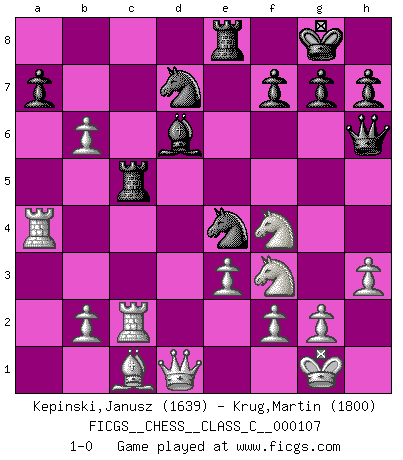 Last move : 1-0 2009 July 27 23:45:3 [Event "FICGS__CHESS__CLASS_C__000107"] [Site "FICGS"] [Date "2009.02.26"] [Round "1"] [White "Kepinski,Janusz"] [Black "Krug,Martin"] [Result "1-0"] [WhiteElo "1639"] [BlackElo "1800"] 1.d4 Nf6 2.c4 e6 3.e3 c5 4.Nf3 d5 5.cxd5 exd5 6.Bb5+ Bd7 7.Bxd7+ Nbxd7 8.O-O Bd6 9.h3 O-O 10.Re1 Rc8 11.Nc3 Re8 12.a4 Ne4 13.Nxd5 cxd4 14.Nxd4 Qh4 15.Re2 Rc5 16.Nf3 Qh5 17.Nf4 Qh6 18.a5 Rf5 19.Rc2 Rc5 20.Ra4 b6 21.axb6 1-0 Queen's pawn game Kingside Castling by player White (move 8) Kingside Castling by player Black (move 9) Player White won this chess game. Follow this game move after move (download)I still hope to kill Fischer. (Boris Spassky) Ich kenne keine einzige Person, die behaupten würde, Garri Kasparow sei ein guter Mensch (Nigel Short) El Ajedrez es el arte del análisis. (Mikhail Botvinnik) Ce qui est bien, c'est d'avoir tout un tas de pièces en prise : l'adversaire ne peut en prendre qu'une à la fois. Cité par Thierry Audin. Mandala - that's it! 16x16 squares as multiple of the four and the eight because of the Four Noble Truths and the Noble Eightfold Path. (Heinz-Georg Lehnhoff about Big Chess)