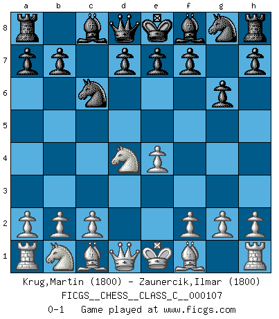 Last move : 0-1 2009 April 9 14:23:55 [Event "FICGS__CHESS__CLASS_C__000107"] [Site "FICGS"] [Date "2009.02.26"] [Round "1"] [White "Krug,Martin"] [Black "Zaunercik,Ilmar"] [Result "0-1"] [WhiteElo "1800"] [BlackElo "1800"] 1.e4 c5 2.Nf3 Nc6 3.d4 cxd4 4.Nxd4 g6 0-1 This chess game has been lost on time (started : 2009.02.26 22:3:32) Sicilian defense Player Black won this chess game. Follow this game move after move (download)Who is your opponent tonight, tonight I am playing against the Black pieces. (Akiba Rubinstein) Schach wird sich dank seiner hohen kulturellen Tradition immer durchsetzen. In näherer Zukunft womöglich sogar als Gegenreaktion auf die maßlose Reizüberflutung im Freizeit- und Spielbereich. (Garry Kasparov) El jugador táctico sabe que hacer cuando hay algo que hacer; mientras que el estratega sabe que hacer cuando no hay nada que hacer. (Gerald Abrahams) 'L'échange des dames est un coup dur pour les deux adversaires...' Un journaliste lors d'une partie du match Spassky-Fischer Indecision is the key to flexibility. (Unknown)