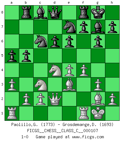 Last move : 1-0 2009 June 26 20:50:22 [Event "FICGS__CHESS__CLASS_C__000107"] [Site "FICGS"] [Date "2009.02.26"] [Round "1"] [White "Paolillo,Giampiero"] [Black "Grosdemange,David"] [Result "1-0"] [WhiteElo "1773"] [BlackElo "1693"] 1.e4 c5 2.Nc3 Nc6 3.f4 g6 4.Nf3 Bg7 5.d3 d6 6.g3 e6 7.Bg2 Nge7 8.O-O O-O 9.Be3 Rb8 10.Qd2 b5 11.a3 a5 12.d4 cxd4 13.Nxd4 1-0 This chess game has been lost on time (started : 2009.02.26 22:3:32) Sicilian : Grand Prix attack Kingside Castling by player White (move 8) Kingside Castling by player Black (move 8) Player White won this chess game. Follow this game move after move (download)Is Bobby Fischer quite sane ? (Salo Flohr) Glücklicherweise sind Großmeister Ruben Fines reine Schachbücher weniger phallozentrisch [als seine Schachpsychologie] und deswegen auch weniger lächerlich. (Nigel Short) Una mala movida nulifica cuarenta buenas. (Horowitz) Si rien de grave n'est détecté lors de l'analyse d'une position, on joue alors le coup. Seconde règle de Blumenfeld. Go and wake up your luck. (Persian saying)