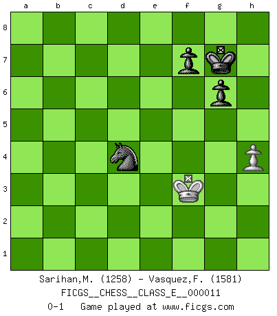 Last move : 0-1 2008 January 28 9:20:38 [Event "FICGS__CHESS__CLASS_E__000011"] [Site "FICGS"] [Date "2006.09.02"] [Round "1"] [White "Sarihan,Mustafa"] [Black "Vasquez,Fernando"] [Result "0-1"] [WhiteElo "1258"] [BlackElo "1581"] 1.e4 e5 2.Nf3 d6 3.Nc3 Nf6 4.d4 Nbd7 5.dxe5 dxe5 6.Bg5 c6 7.Bc4 Bb4 8.Bxf6 Bxc3+ 9.bxc3 Qxf6 10.O-O Nb6 11.Be2 O-O 12.a4 Rd8 13.Qc1 Bg4 14.h3 Bxf3 15.Bxf3 Nc4 16.Rd1 Rxd1+ 17.Qxd1 Rd8 18.Qe2 Nd2 19.Bg4 Qg5 20.a5 g6 21.Rd1 b5 22.axb6 axb6 23.g3 h5 24.Bf3 h4 25.Bg4 hxg3 26.fxg3 Rd6 27.Kh1 b5 28.Qe1 Qd8 29.Ra1 Kg7 30.Rd1 Nc4 31.Rxd6 Qxd6 32.Kg2 Qc5 33.Qf2 Qa3 34.Qf3 Qc1 35.Qd3 Ne3+ 36.Kf2 Nxc2 37.Bd7 b4 38.cxb4 Nxb4 39.Qe2 Qc3 40.Qe3 Qc2+ 41.Qe2 Qc5+ 42.Qe3 Qc4 43.h4 Qa2+ 44.Kg1 Qb1+ 45.Kf2 Nc2 46.Qd3 Qe1+ 47.Kf3 Nd4+ 48.Kg2 c5 49.Be8 c4 50.Qxc4 Qxe4+ 51.Kf2 Qf3+ 52.Ke1 Kf8 53.Bb5 Qxg3+ 54.Kf1 Qf4+ 55.Kg1 Nf3+ 56.Kf2 e4 57.Qb4+ Kg7 58.Qc3+ Nd4 59.Kg2 Qf3+ 60.Qxf3 exf3+ 61.Kf2 Nxb5 62.Kxf3 Nd4+ 0-1 Philidor's defense Kingside Castling by player White (move 10) Kingside Castling by player Black (move 11) 10 pieces endgame at move 53 : White KQBP , Black KQNPPP WHITE : King + 1 Queen 1 Bishop 1 Pawn BLACK : King + 1 Queen 1 Knight 3 Pawns 9 pieces endgame at move 60 : White KQBP , Black KNPPP WHITE : King + 1 Queen 1 Bishop 1 Pawn BLACK : King + 1 Knight 3 Pawns 8 pieces endgame at move 60 : White KBP , Black KNPPP WHITE : King + 1 Bishop 1 Pawn BLACK : King + 1 Knight 3 Pawns 7 pieces endgame at move 61 : White KP , Black KNPPP WHITE : King + 1 Pawn BLACK : King + 1 Knight 3 Pawns 6 pieces endgame at move 62 : White KP , Black KNPP WHITE : King + 1 Pawn BLACK : King + 1 Knight 2 Pawns Player Black won this chess game. Follow this game move after move (download)We cannot resist the fascination of sacrifice, since a passion for sacrifices is part of a Chessplayer's nature. (Rudolf Spielman) Wenn du auf das Glück wartest, wird das Leben ziemlich langweilig. (Mikhail Nekhemyevich Tal) Los finales de Peón son del Ajedrez lo que el cesped es del Golf. (Cecil Purdy) À la honte des hommes, on sait que les lois du jeu sont les seules qui soient partout justes, claires, inviolables et exécutées. Pourquoi l'Indien qui a donné les règles du jeu d'échecs est-il obéi de bon gré dans toute la terre, et que les décrétales des papes, par exemple, sont aujourd'hui un objet d'horreur et de mépris ? C'est que l'inventeur des échecs combina tout avec justesse pour la satisfaction des joueurs, et que les papes, dans leurs décrétales, n'eurent en vue que leur seul avantage. L'Indien voulut exercer également l'esprit des hommes et leur donner du plaisir; les papes ont voulu abrutir l'esprit des hommes. Voltaire (Dictionnaire philosophique / Garnier 1967) If we don't succeed, we run the risk of failure. (George W. Bush)