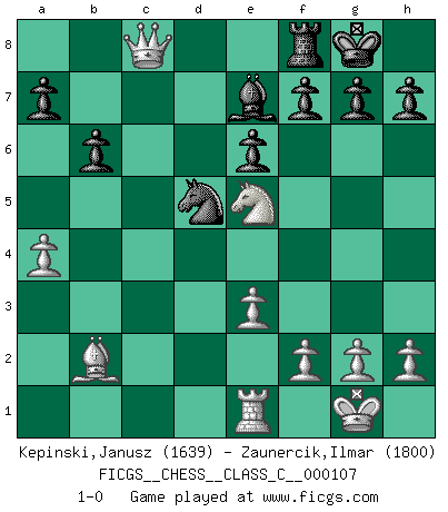 Last move : 1-0 2009 August 8 12:42:54 [Event "FICGS__CHESS__CLASS_C__000107"] [Site "FICGS"] [Date "2009.02.26"] [Round "1"] [White "Kepinski,Janusz"] [Black "Zaunercik,Ilmar"] [Result "1-0"] [WhiteElo "1639"] [BlackElo "1800"] 1.d4 d5 2.c4 e6 3.e3 Nf6 4.Nf3 Be7 5.Be2 O-O 6.O-O Nbd7 7.b3 b6 8.Bb2 Bb7 9.Nc3 c5 10.cxd5 Nxd5 11.Nxd5 Bxd5 12.Bc4 Nf6 13.Re1 Bxc4 14.bxc4 Rc8 15.a4 cxd4 16.Bxd4 Rxc4 17.Ne5 Rc7 18.Rc1 Nd5 19.Bb2 Rxc1 20.Qxc1 Qc8 21.Qxc8 1-0 This chess game has been lost on time (started : 2009.02.26 22:3:32) Queen's gambit declined Kingside Castling by player Black (move 5) Kingside Castling by player White (move 6) Player White won this chess game. Follow this game move after move (download)Many Chess players were surprised when after the game, Fischer quietly explained: 'I had already analyzed this possibility' in a position which I thought was not possible to foresee from the opening. (Mikhail Tal) Rubinstein ist ein Turmendspiel, welches die Götter vor tausenden von Jahren begannen. (Savielly Grigorievitsch Tartakower) El Ajedrez es el juego mas altamente simbólico, pero las agresiones estan por lo tanto aún mas francamente representadas en la partida. Tal vez comenzo como un juego de guerra; Algo como la representación de una batalla en miniatura entre las fuerzas de dos reinos. (Karl Meninger) Vous n'êtes pas toujours obligé de jouer le meilleur coup. Un coup doit être actif, entreprenant, correct et beau ! (David Bronstein) A mistake is only a mistake if you let it happen twice. Otherwise it is a learning experience. (Daniel Parmet)