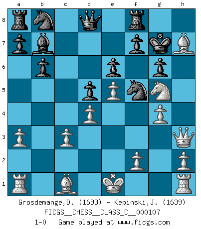 Last move : 1-0 2009 April 11 22:50:56 [Event "FICGS__CHESS__CLASS_C__000107"] [Site "FICGS"] [Date "2009.02.26"] [Round "1"] [White "Grosdemange,David"] [Black "Kepinski,Janusz"] [Result "1-0"] [WhiteElo "1693"] [BlackElo "1639"] 1.e4 e6 2.d4 d5 3.e5 b6 4.c3 c5 5.Nf3 cxd4 6.cxd4 Bb7 7.Nc3 Bb4 8.a3 Bxc3+ 9.bxc3 Ne7 10.Bd3 O-O 11.Bxh7+ Kh8 12.Ng5 g6 13.Qf3 Nf5 14.Qh3 Kg7 15.g4 1-0 French : Advance variation Kingside Castling by player Black (move 10) Player White won this chess game. Follow this game move after move (download)We must make sure that Chess will not be like a dead language, very interesting, but for a very small group. (Sytze Faber) Vielleicht wirkt die Aura früherer Spieler glanzvoller als die der heutigen Spieler, aber das liegt daran, dass man kein Programm wie Fritz hatte, das einem all die Löcher in ihren Partien zeigt. (Vladimir Kramnik) Aunque la mayoría de la gente disfruta observar las partidas de los grandes Maestros de ataque, algunos de los jugadores mas notables en la historia han sido los jugadores silenciosos posicionales. Lentamente ellos te aplastan despojandote de tu espacio, congestionando tus piezas y dejandote virtualmente sin nada que hacer. (Yasser Seirawan) Les erreurs sont comme les malheurs, elles n'arrivent jamais seules. (Siegbert Tarrasch) Computer Science is no more about computers than astronomy is about telescopes. (Edsger W. Dijkstra)